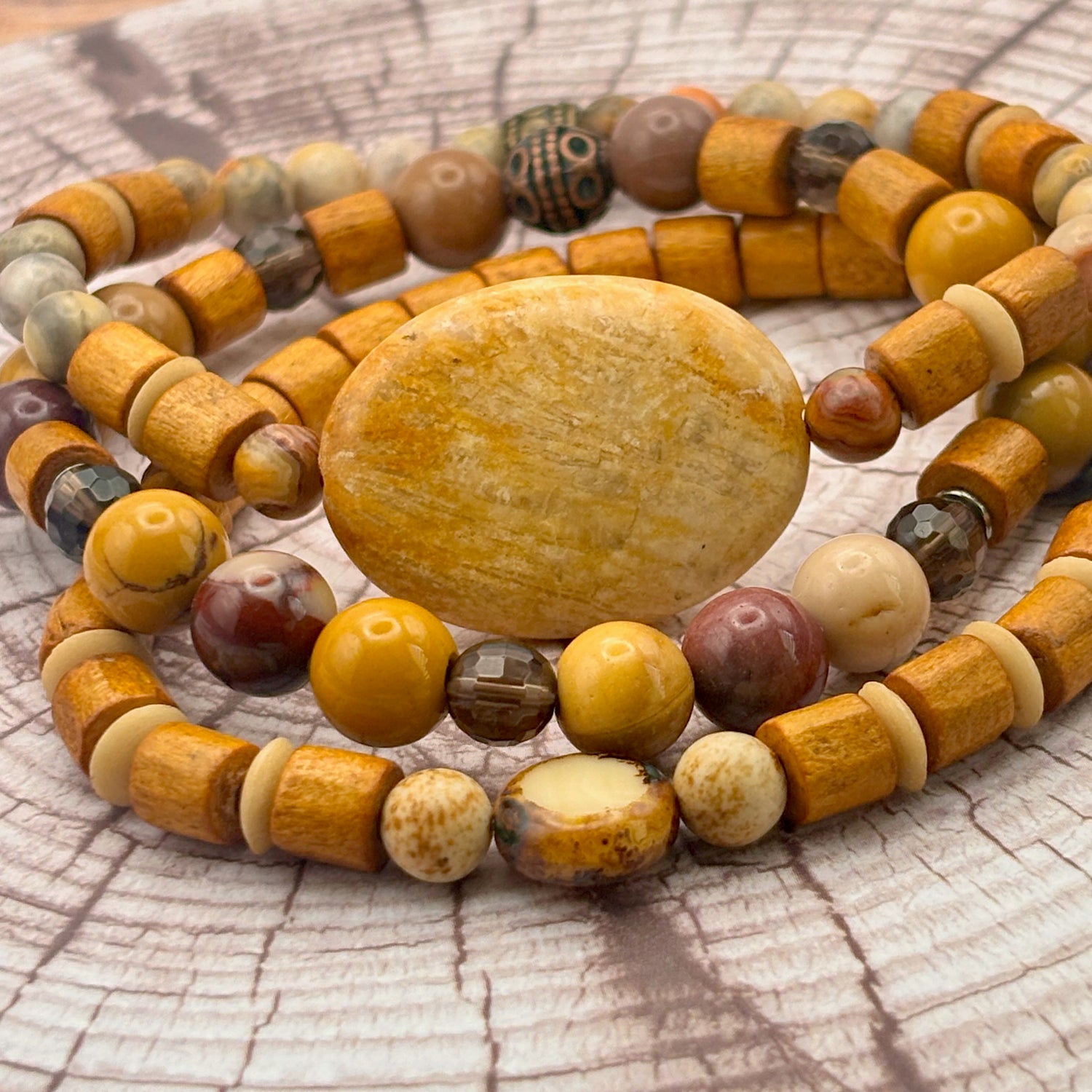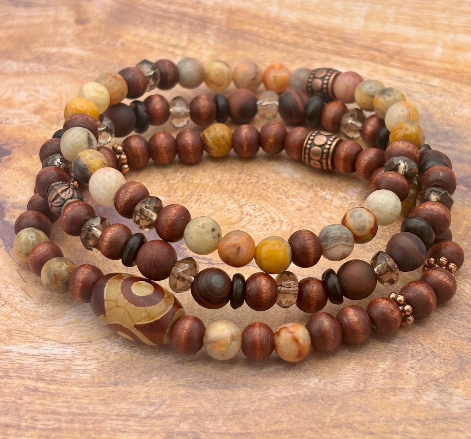 Strong, steady, and timeless — this trio carries the wisdom of earth and the strength of spirit. Deep wood beads anchor the energy, while jasper and agate guide resilience, adaptability, and purpose. A stack that grounds and protects, reminding you that every path is a step toward center.