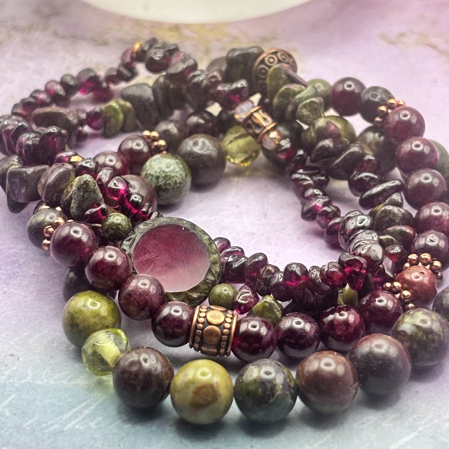 Deep garnet reds and earthy greens unite in this powerful quartet, blending fire’s spark with earth’s steady resilience. Like glowing embers against stone, this stack fuels courage and passion while grounding and protecting the heart. A talisman of transformation and renewal, it reminds you that true strength is both fierce and enduring.