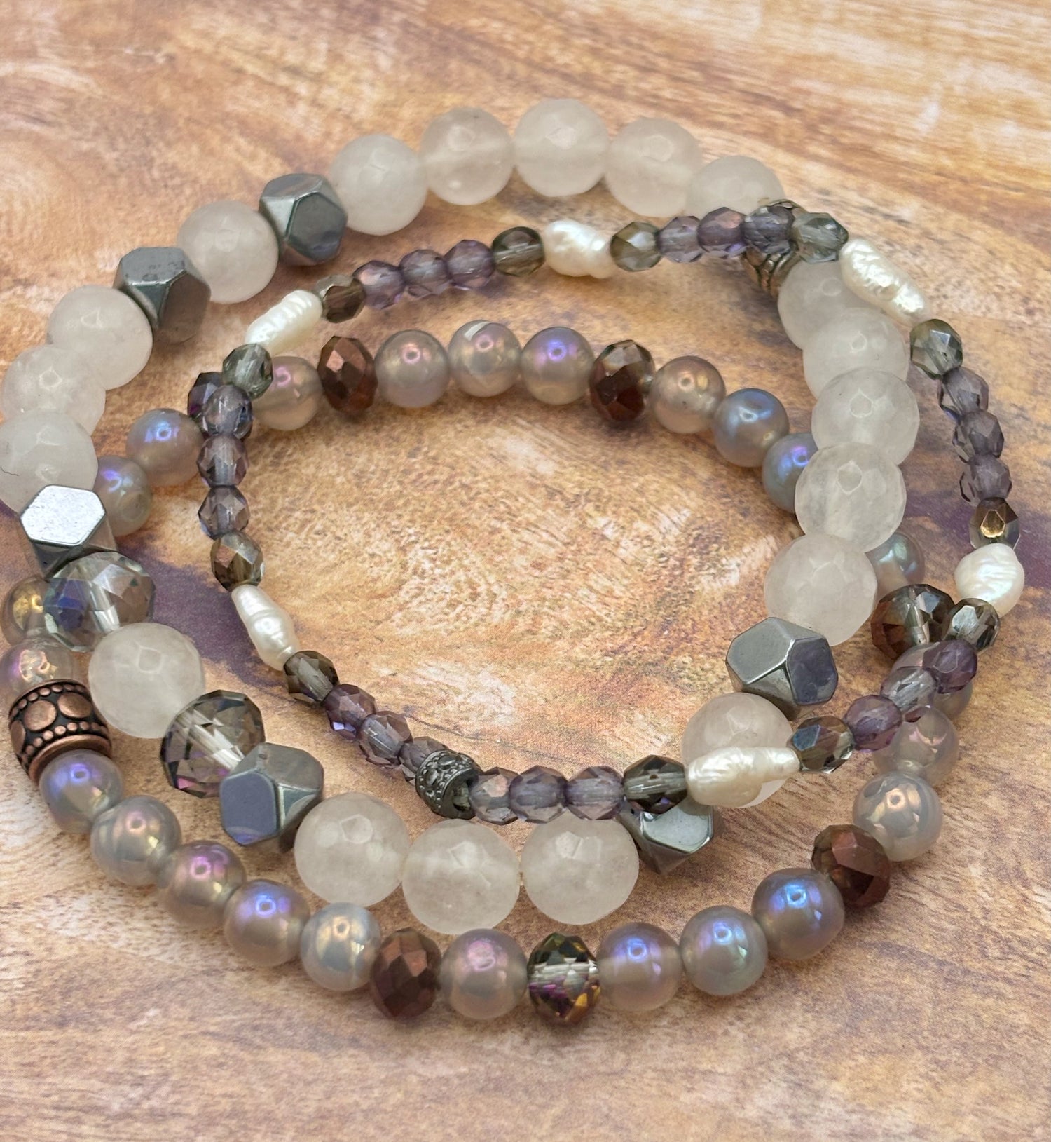 Soft whites, shimmering pearls, and iridescent tones layer together in this luminous trio, carrying the quiet clarity of moonlight and the protective shimmer of the night sky. A radiant balance of intuition, reflection, and higher vision, this stack guides you inward while keeping you attuned to the cosmic beyond.