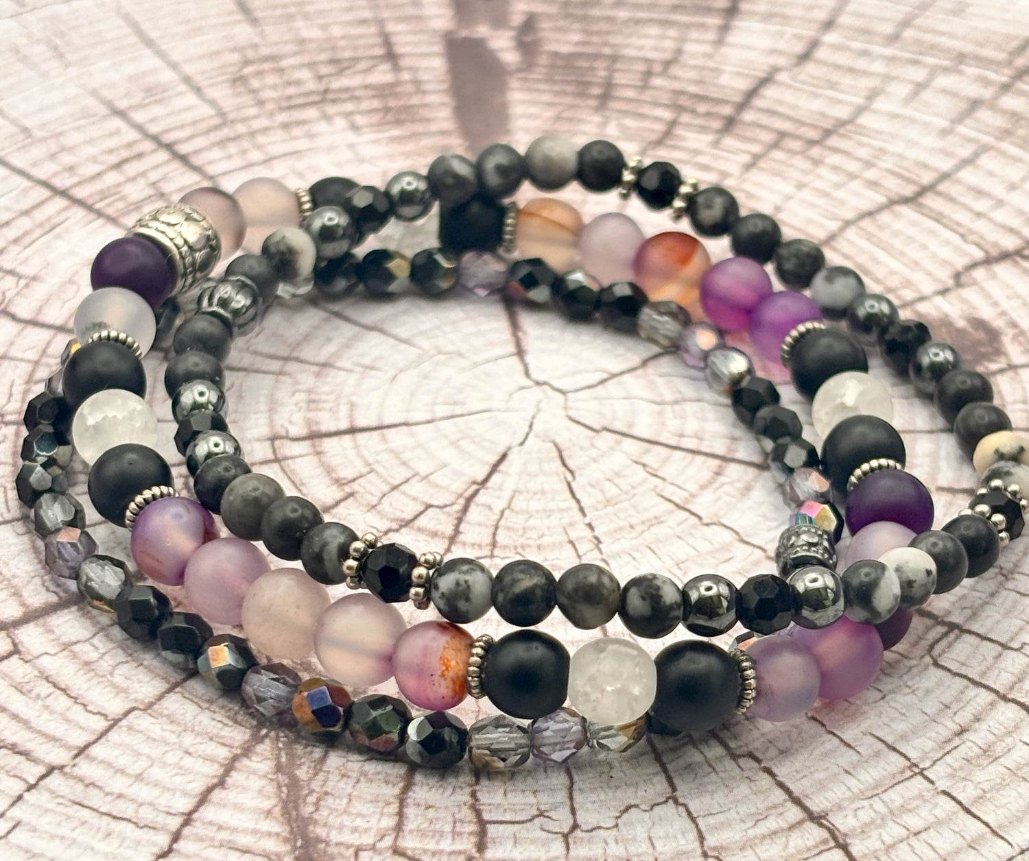 Dark grays, black, and violet tones converge in this protective trio, a shield against illusion and a guide toward higher truth. Like the quiet threshold between day and night, this stack balances mystery with illumination — grounding you in awareness while awakening spiritual clarity.