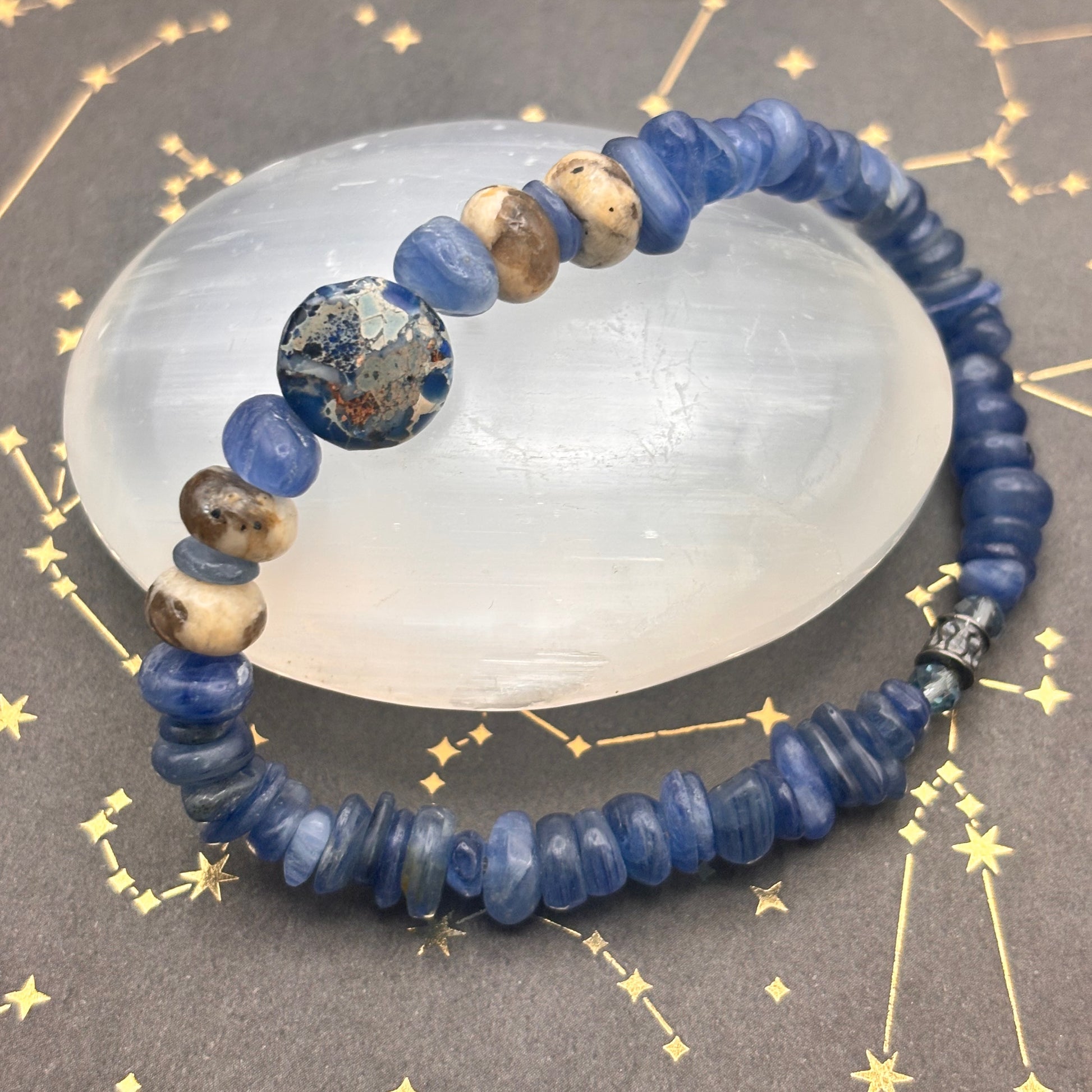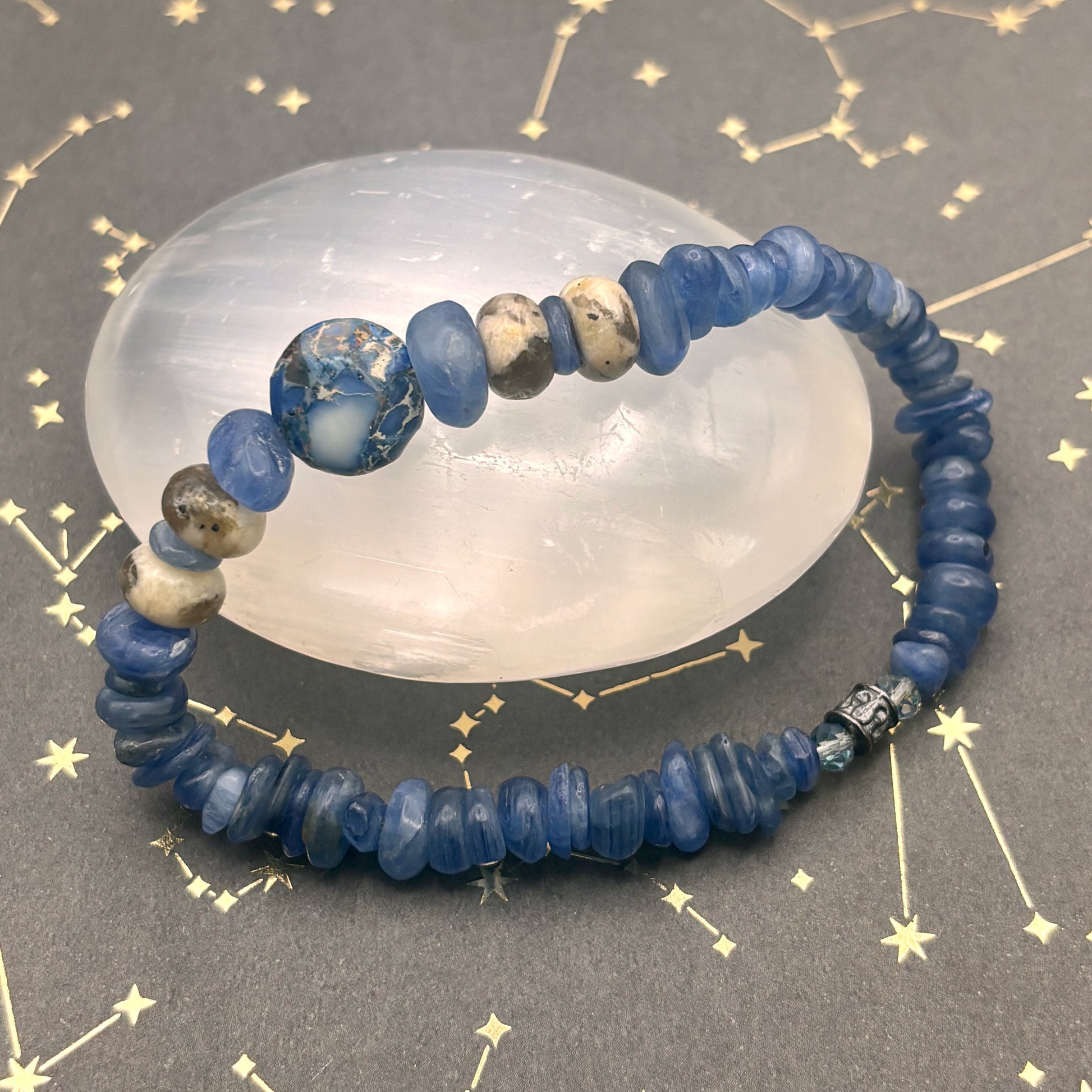 Like a quiet tuning fork for the soul, Attune brings your inner and outer worlds into harmony. Radiant strands of blue kyanite shimmer like frozen sound waves—stones of alignment, clarity, and high-vibration energy. Known for enhancing intuition and clearing energetic blockages, kyanite doesn’t hold negativity—it simply flows, guiding you back to your natural rhythm.