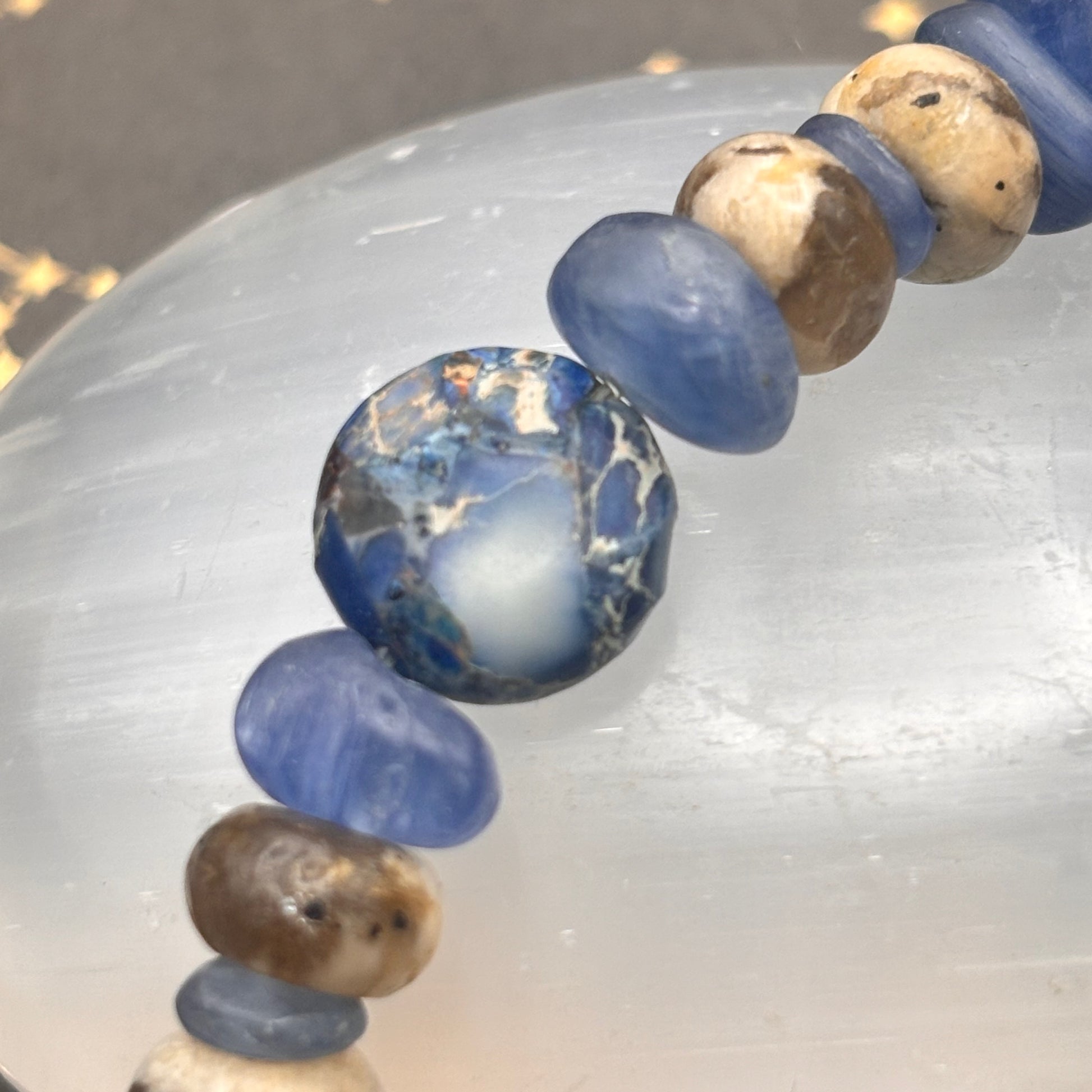Warmed by the grounding tones of desert feldspar, the energy softens and stabilizes, helping you integrate insight without becoming unmoored. At the center lies an imperial jasper coin, swirling with earthy blue and tan—reminding you that balance isn’t static, it’s an ever-shifting dance between knowing and being, spirit and body, silence and movement.