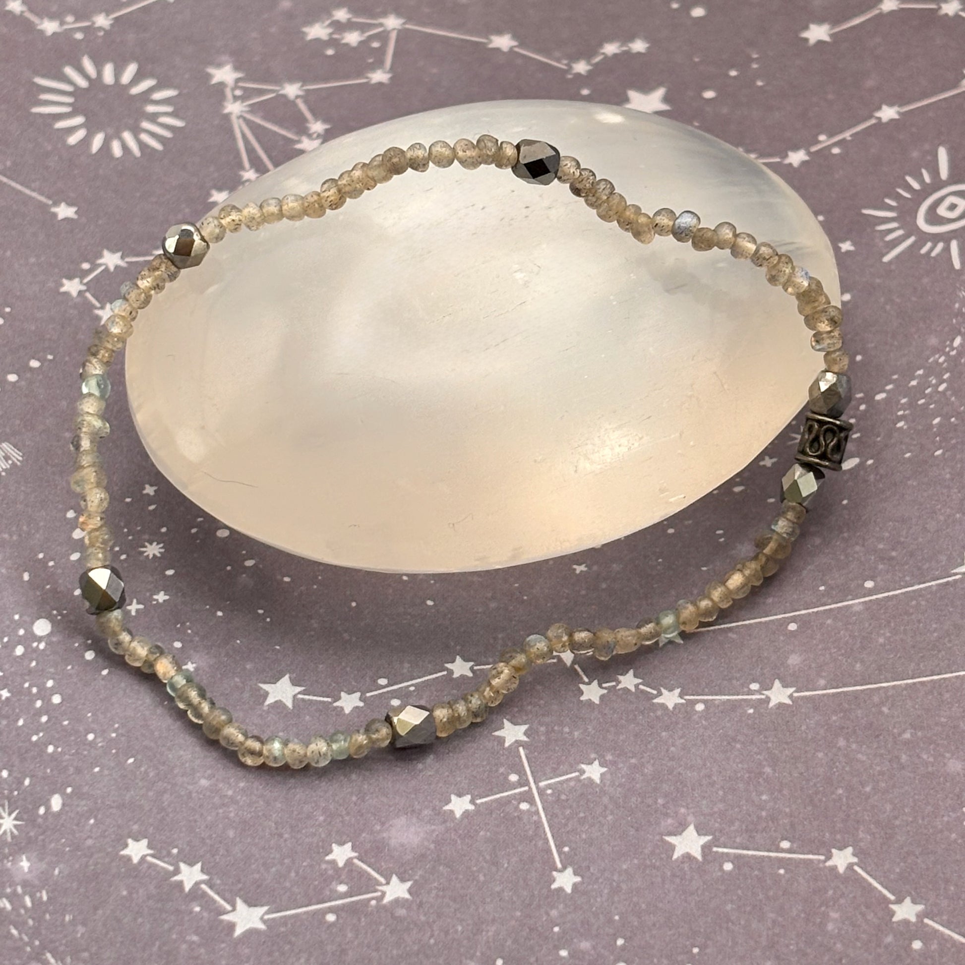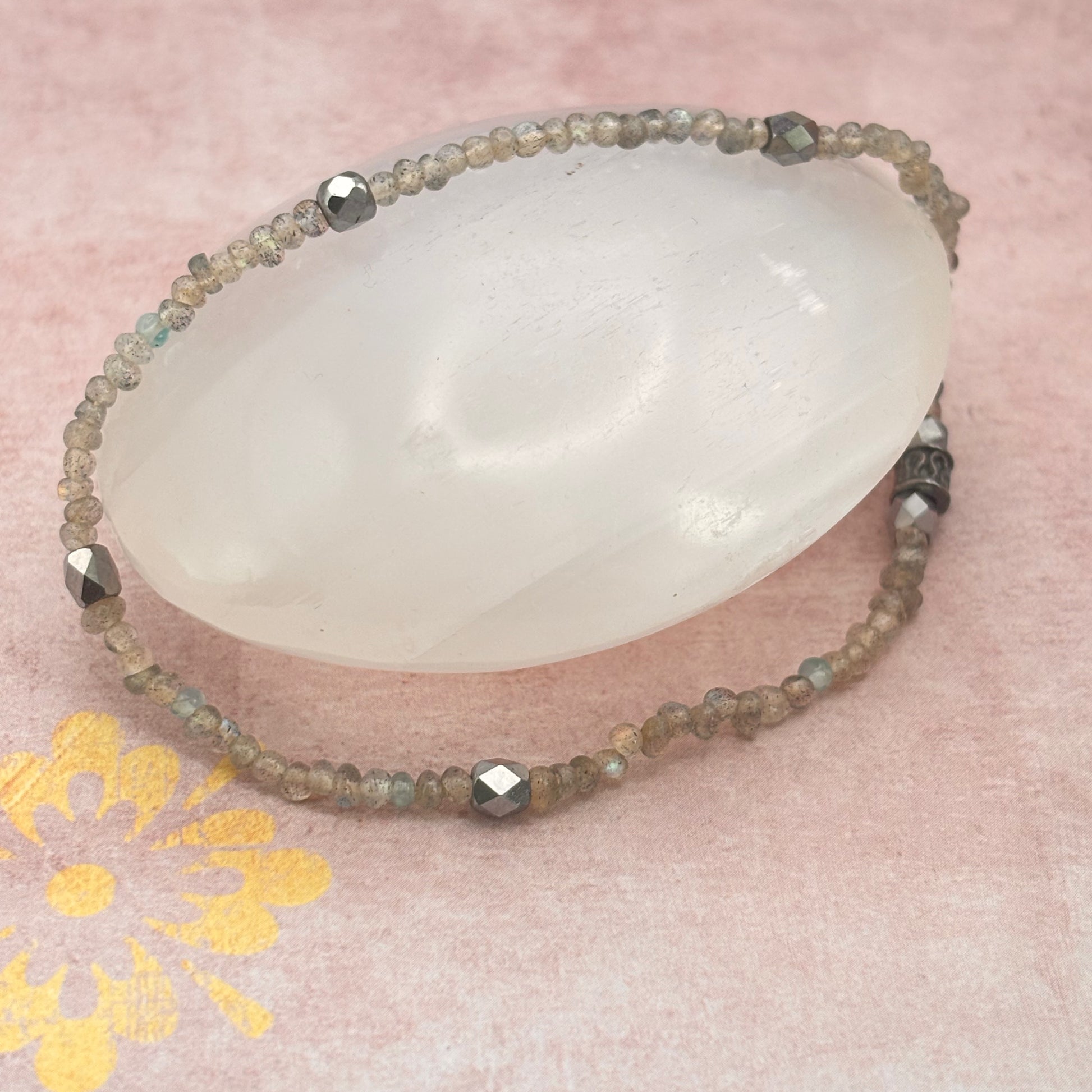 Mystical, radiant, and deeply protective, Celestial Whisper is a talisman for those who walk between worlds. Shimmering labradorite reveals hidden flashes of blue and gold, awakening intuition, shielding your energy, and guiding you toward your soul’s true course. Metallic Czech glass beads glimmer like faraway constellations, reflecting the quiet promise that light is always present—even in the darkest hours.