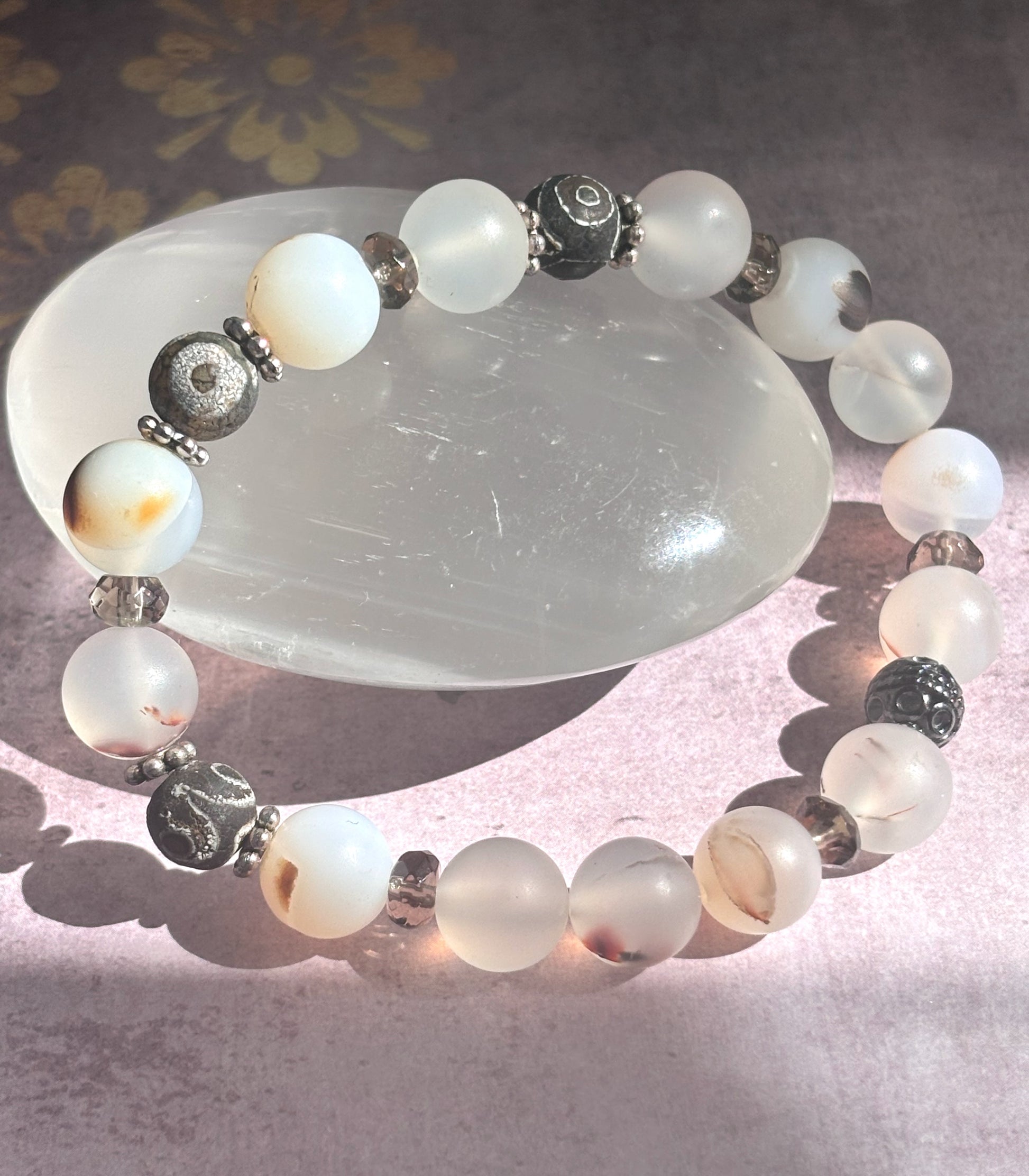 In the stillness where shadows meet the glow, clarity rises. Shadow & Light blends Dendritic Chalcedony’s serene depth with the ancient strength of Tibetan agate, anchoring your spirit against life’s turbulence. Smoky quartz threads through like a grounding breath, transmuting negativity into stability and calm. This is a talisman of presence and resilience—a quiet power for those who seek peace without losing strength.