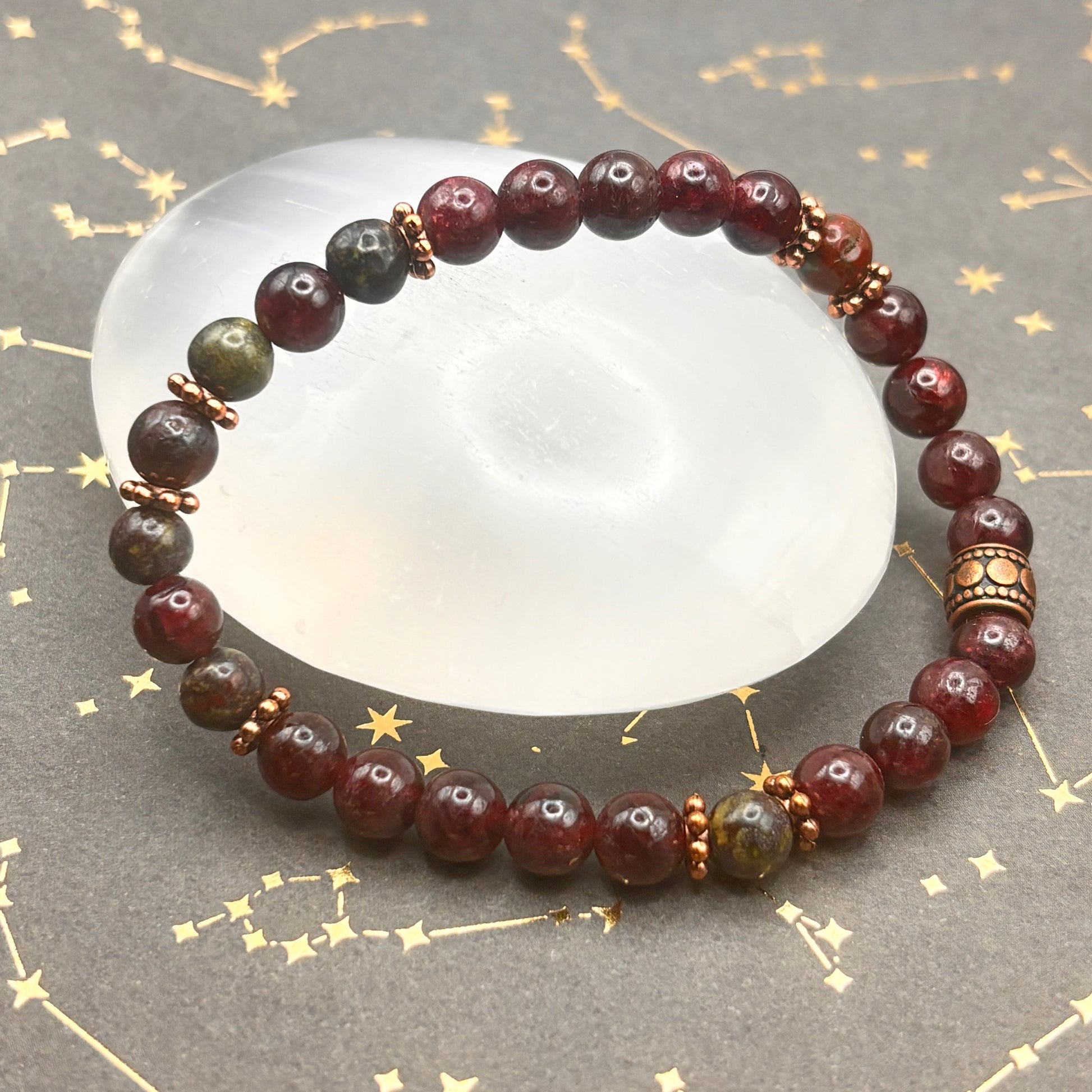 Garnet stokes your inner flame — enhancing vitality, dissolving fear, and calling forth fierce love and commitment. Dragon’s blood jasper adds wisdom to the passion, anchoring you in truth and helping you stay present when emotions run high. Copper accents amplify the energy, increasing flow and focus like a current through the soul.