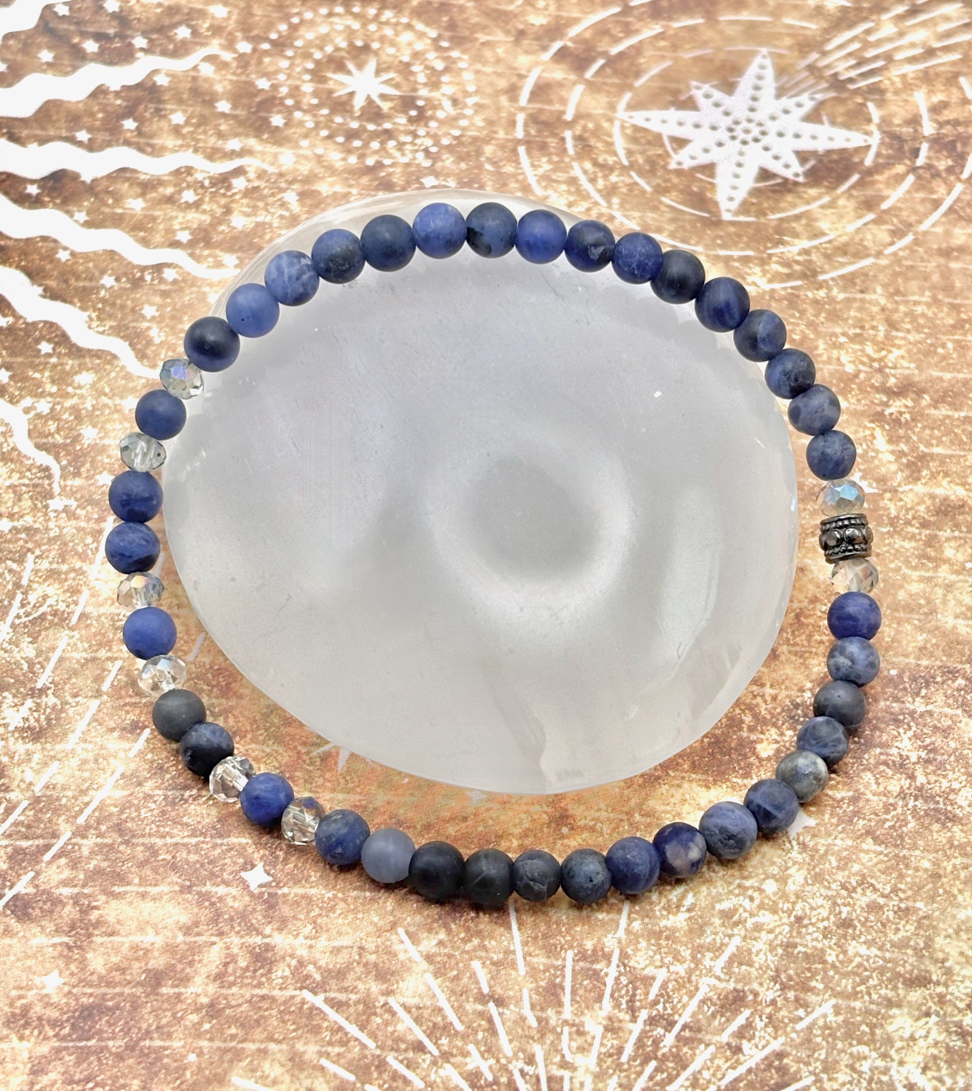 This bracelet features sodalite, the stone of clarity and calm. Known for enhancing self-esteem and emotional balance, sodalite encourages forgiveness and dissolves tension—both within and around you. It unites logic and intuition, making it a powerful ally for creators, communicators, and visionaries. When inspiration feels blocked or your mind is cluttered, sodalite helps restore flow, opening space for creative expression and honest dialogue.