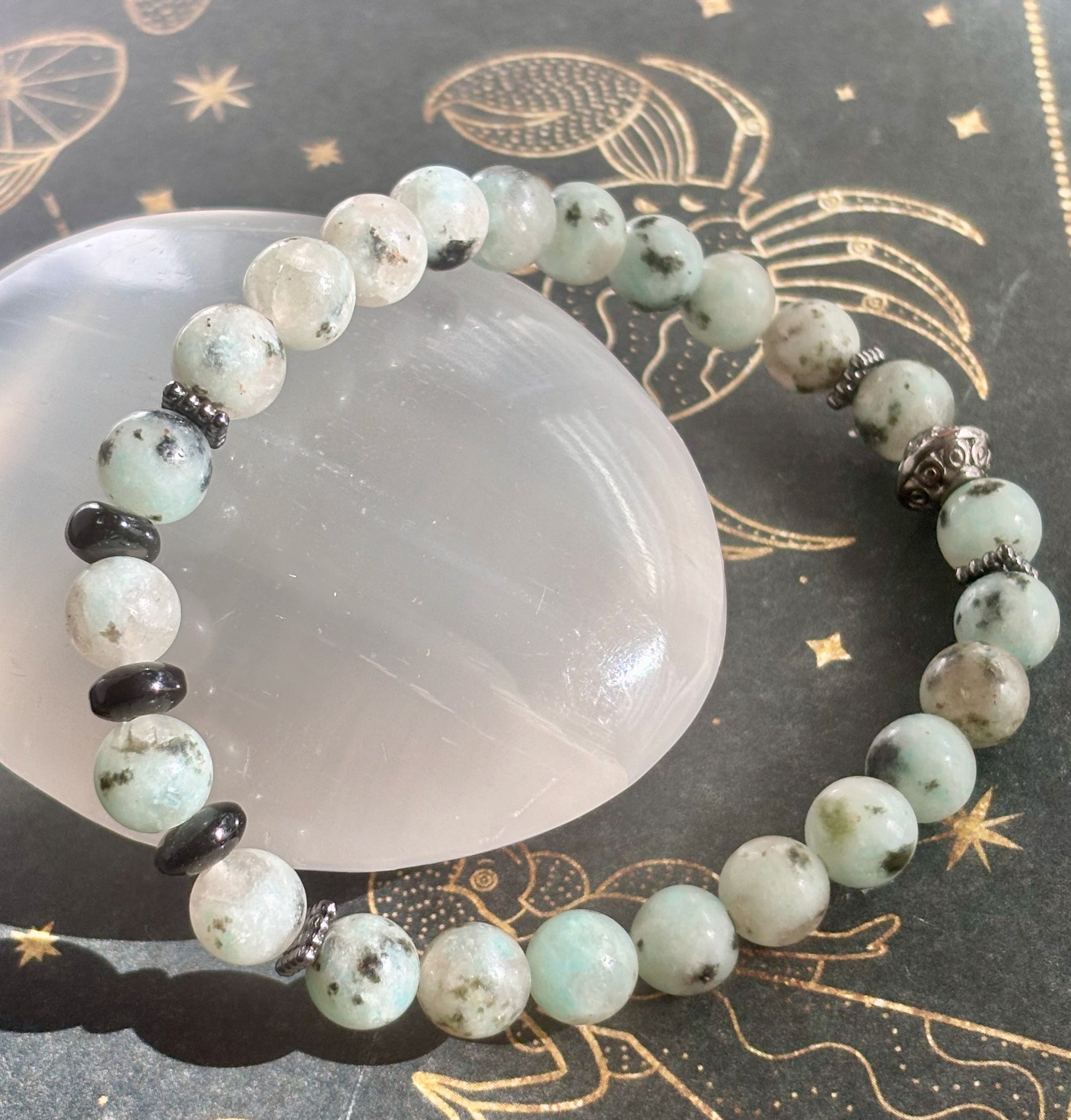 In a world that moves fast, this piece is your reminder to slow down, breathe, and gather your energy where it matters most. Formed from Kiwi Jasper, these stones radiate calm—a soothing balm for the anxious heart—while the black accents anchor you, pulling your spirit back to center. Known as a nurturing stone, Kiwi Jasper offers emotional support, eases anxiety, and restores harmony between mind, body, and spirit.