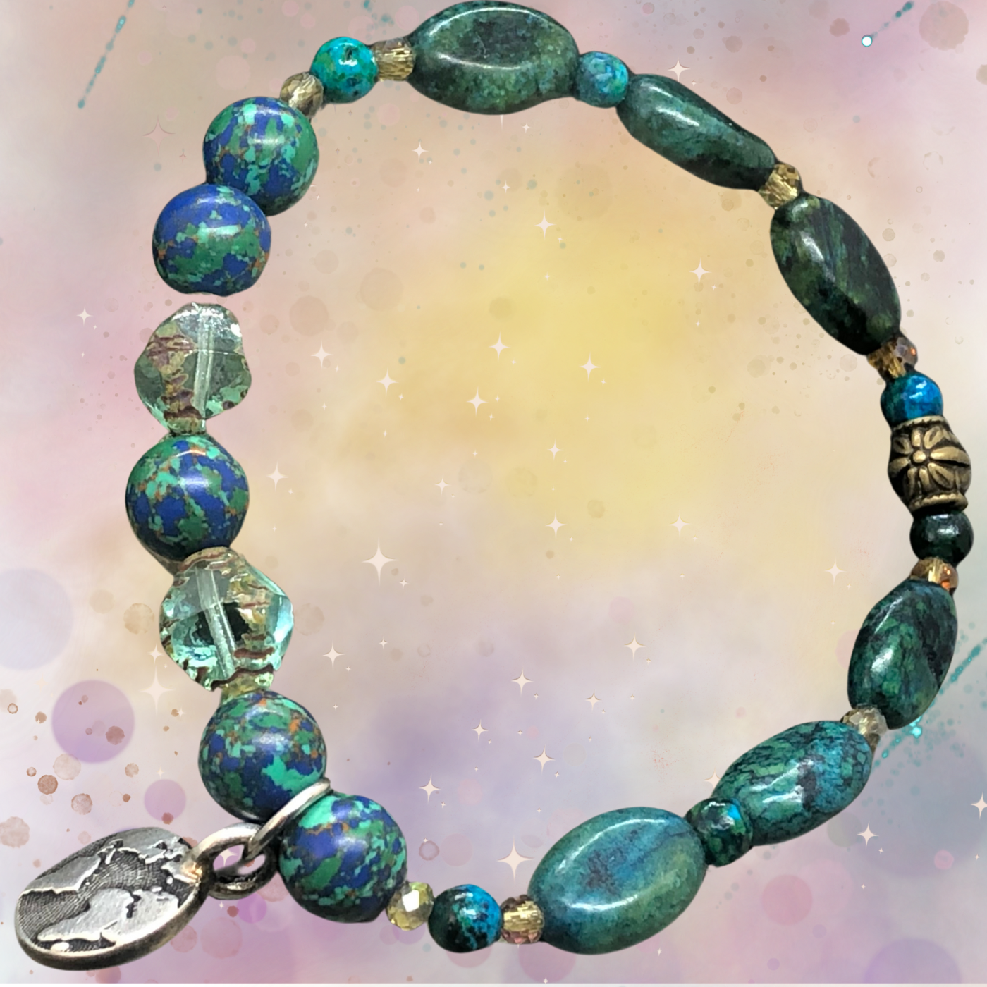 Worlds Within invites you to carry the wisdom of the Earth wherever you roam. The swirling blues and verdant greens of Australian and Imperial Jasper mirror oceans meeting land—a perfect balance of serenity and strength. These stones are guardians of stability and courage, offering grounding energy when the world feels vast and unpredictable. Jasper teaches patience, resilience, and the beauty of steady progress. Paired with faceted Czech glass for subtle sparkle, this bracelet is a reminder that even in constant motion, you are rooted. The silver Earth charm serves as your compass—a symbol of unity, exploration, and infinite connection.