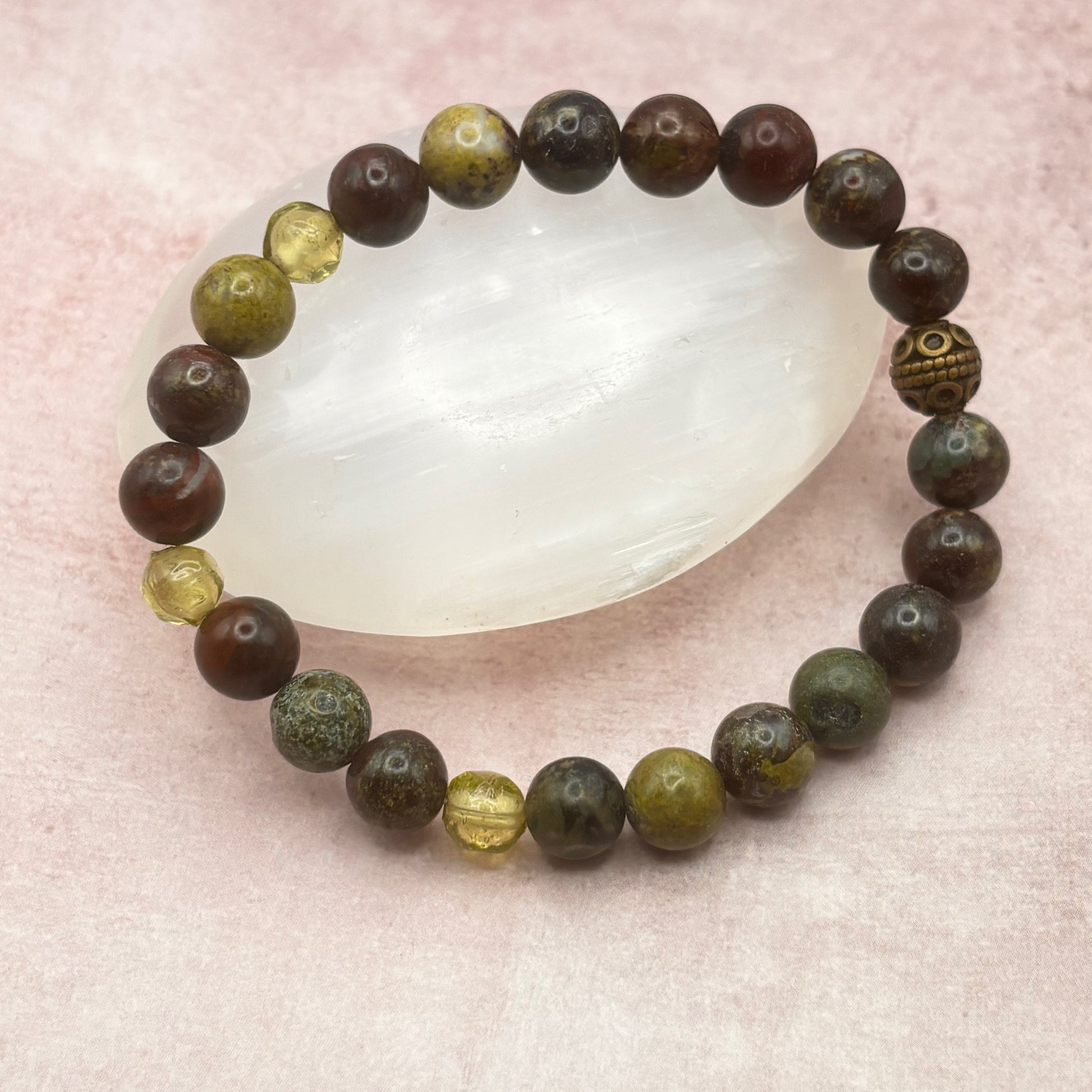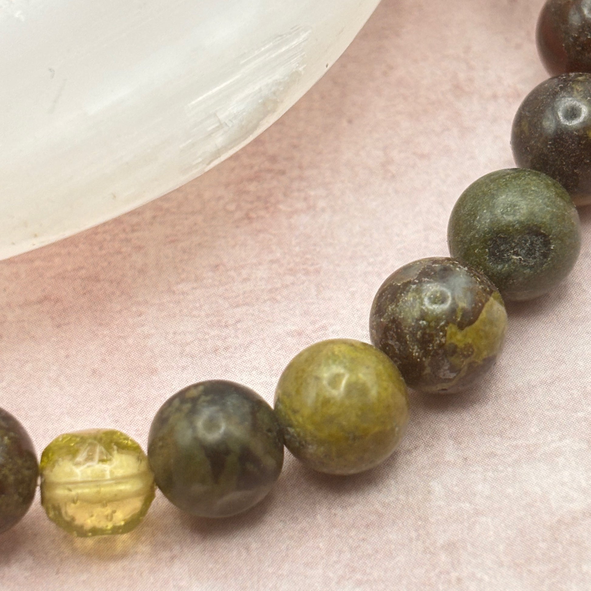 This grounding stone helps you adapt through change, face the truth with grace, and move forward with patience, especially in matters of the heart, career, and personal growth. Light green glass beads add a glint of renewal, symbolizing perspective shifts and budding joy. It’s a reminder: growth is happening, even when you can’t see it yet.