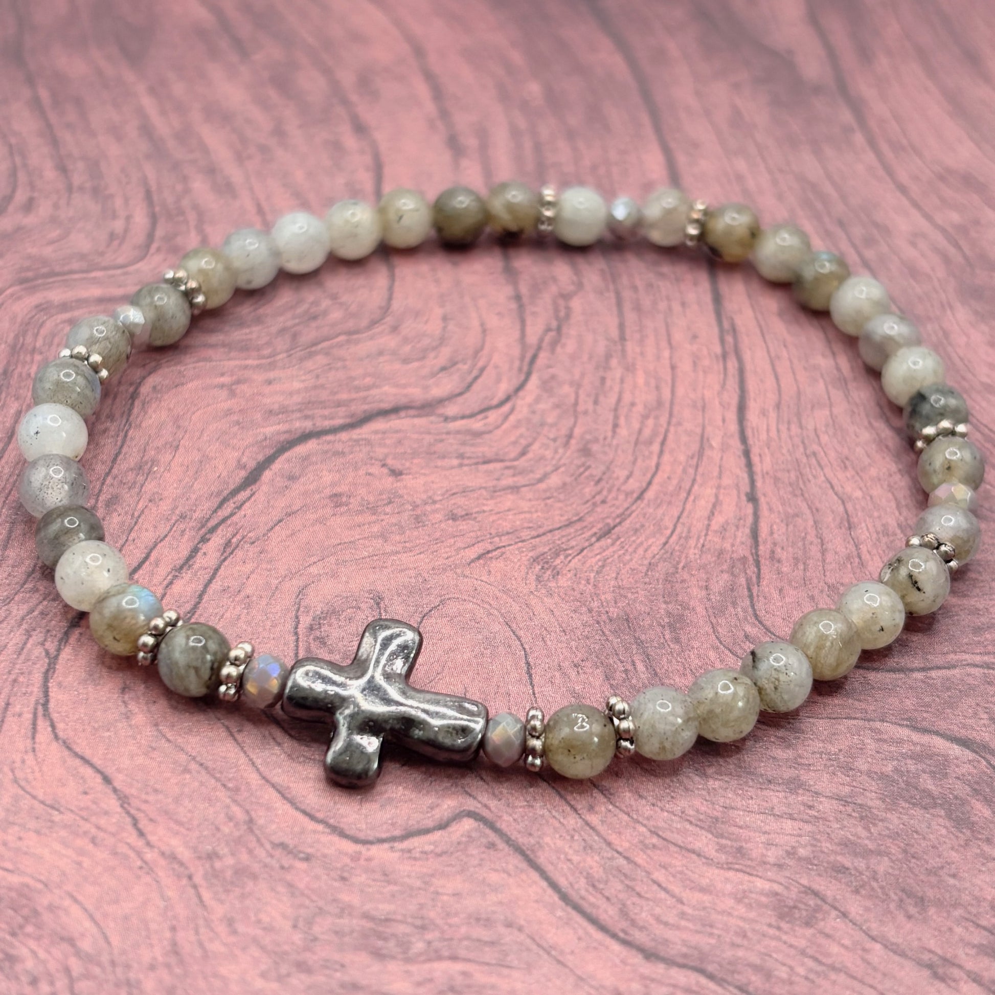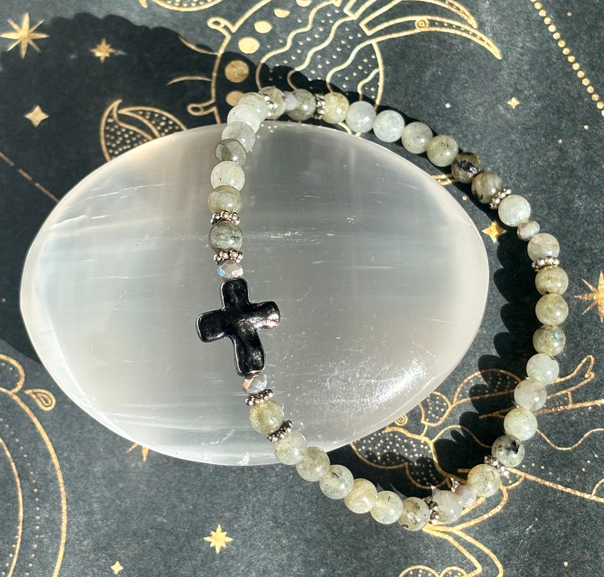 This bracelet blends labradorite's mystical glow with the enduring symbol of faith — a cross at its center. Labradorite is the stone of intuition and transformation, a guardian of energy that shields your aura and illuminates hidden truths. Its iridescent flashes whisper of magic and potential, guiding you toward clarity and deeper self-trust. The antique silver cross serves as an anchor for your beliefs, offering strength in moments of uncertainty.