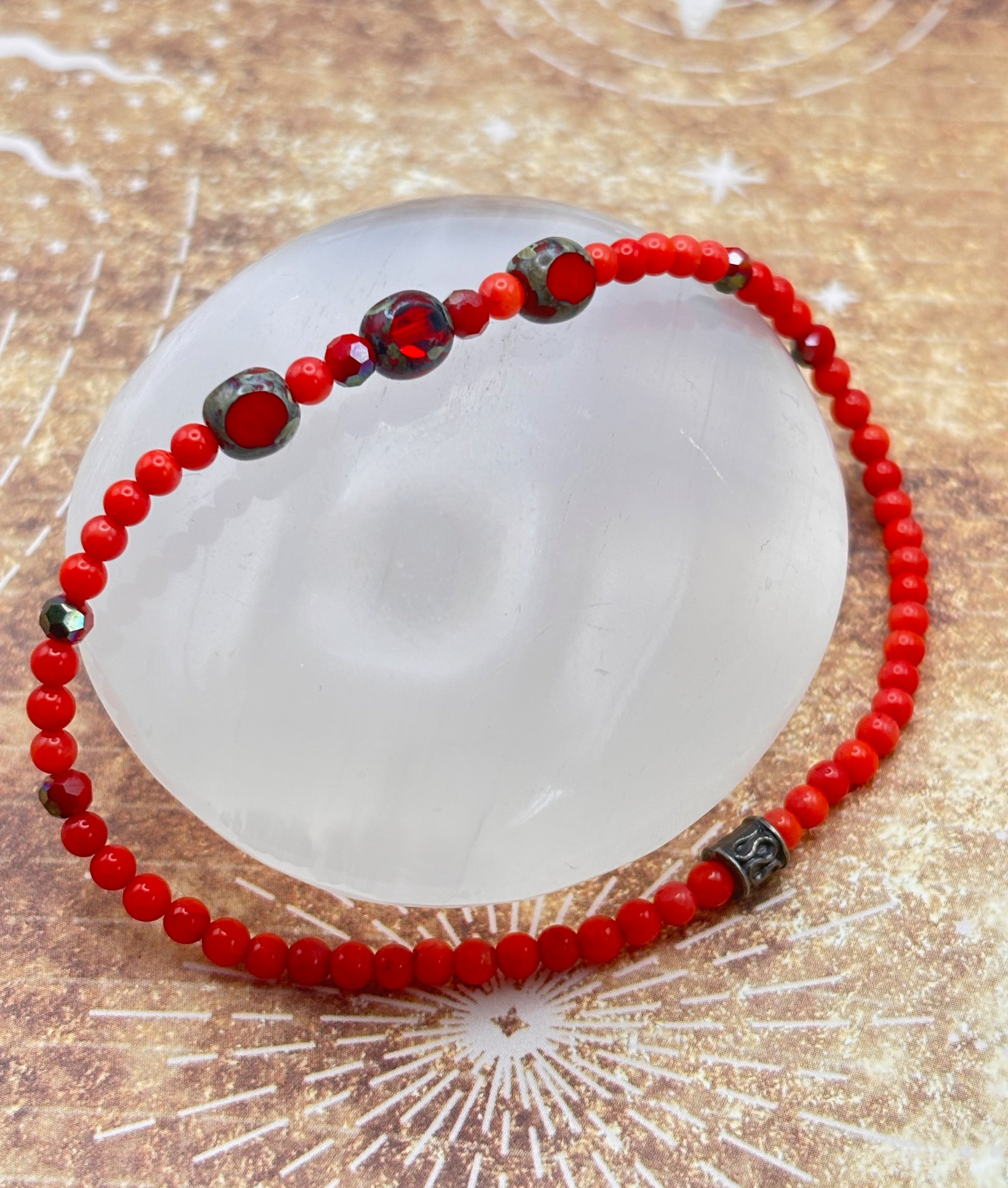 Small but mighty, Ignite may look delicate, but its energy is anything but. This bracelet blazes with bold red beads and fiery Czech glass accents, radiating vitality, courage, and unstoppable momentum.
