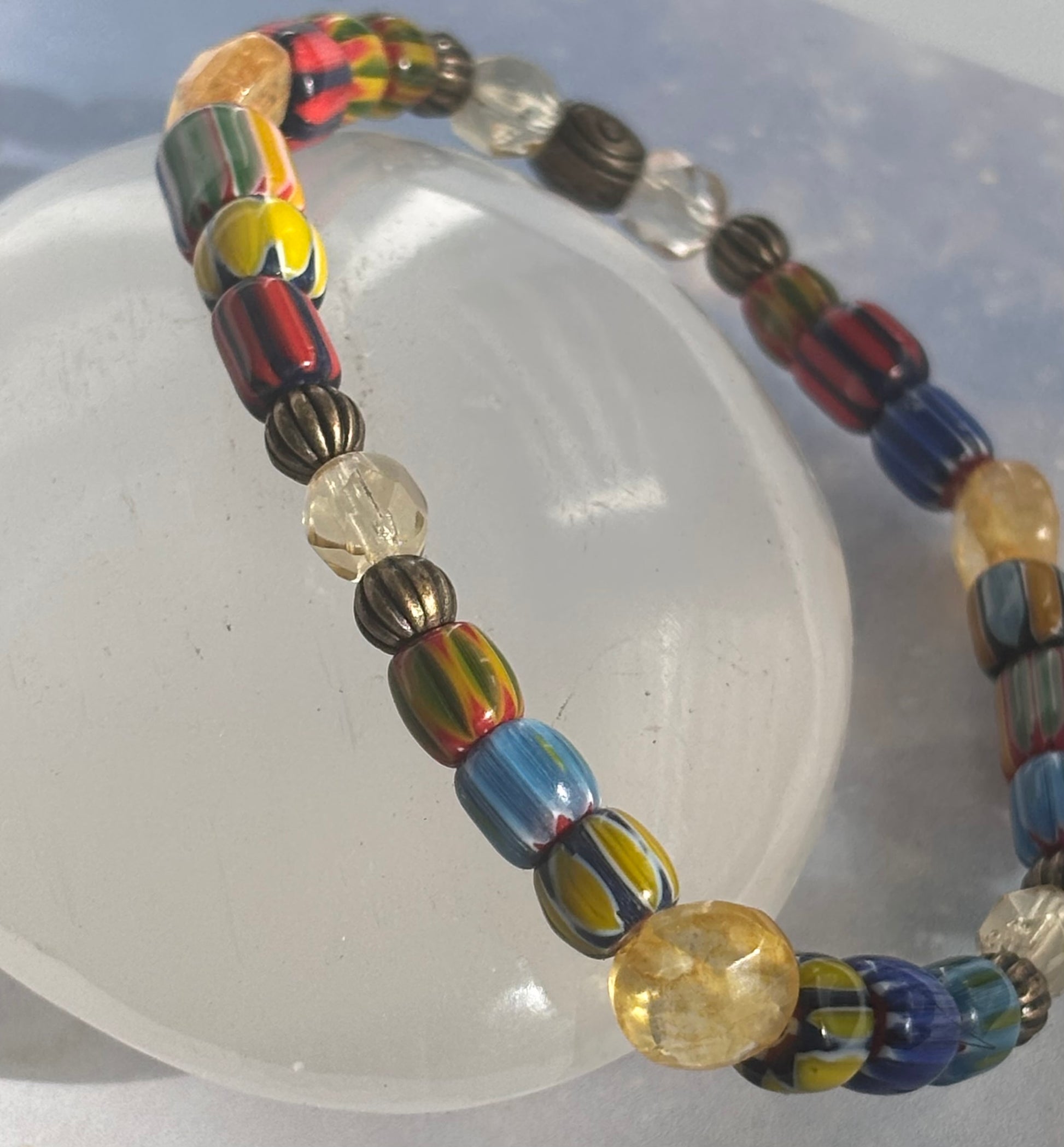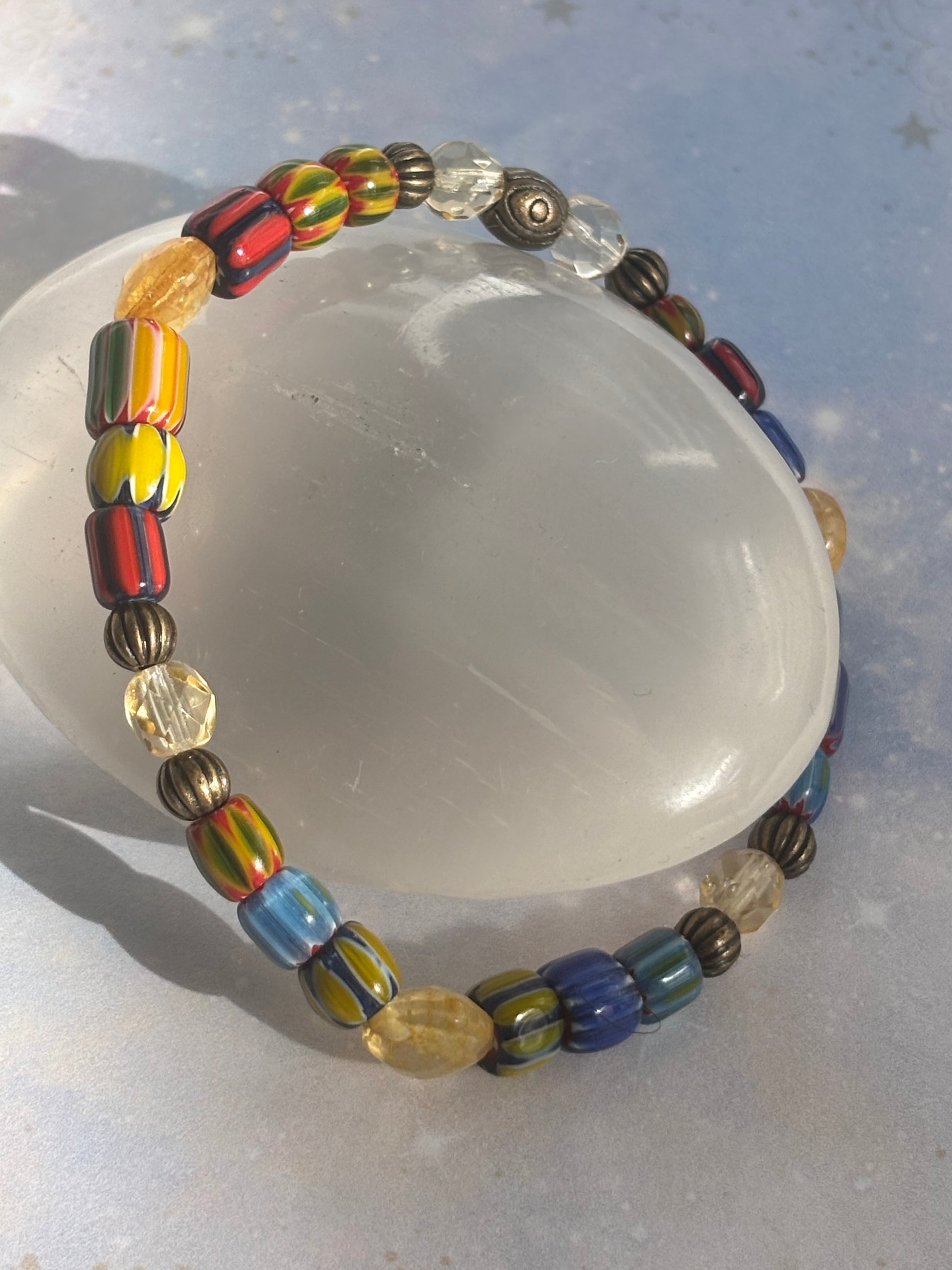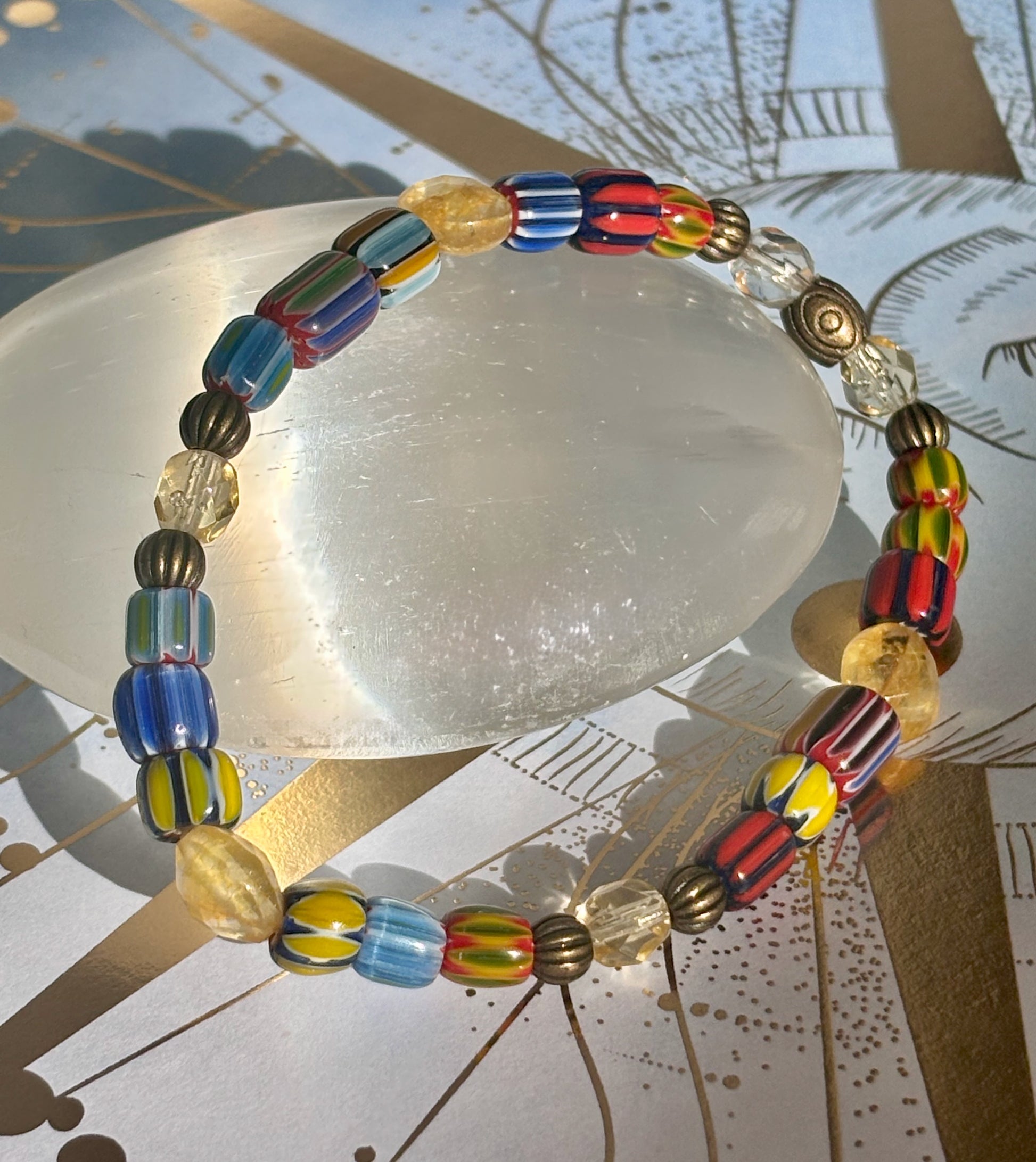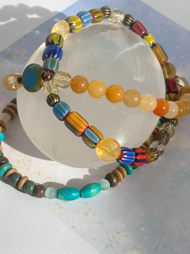 Bold, bright, and overflowing with cosmic optimism. Jupiter is a celebration of color and creativity, featuring playful lampwork glass beads, warm golden accents, and luminous citrine for a dose of pure sunshine energy. Citrine amplifies abundance, confidence, and joy, aligning perfectly with Jupiter’s expansive and generous nature.