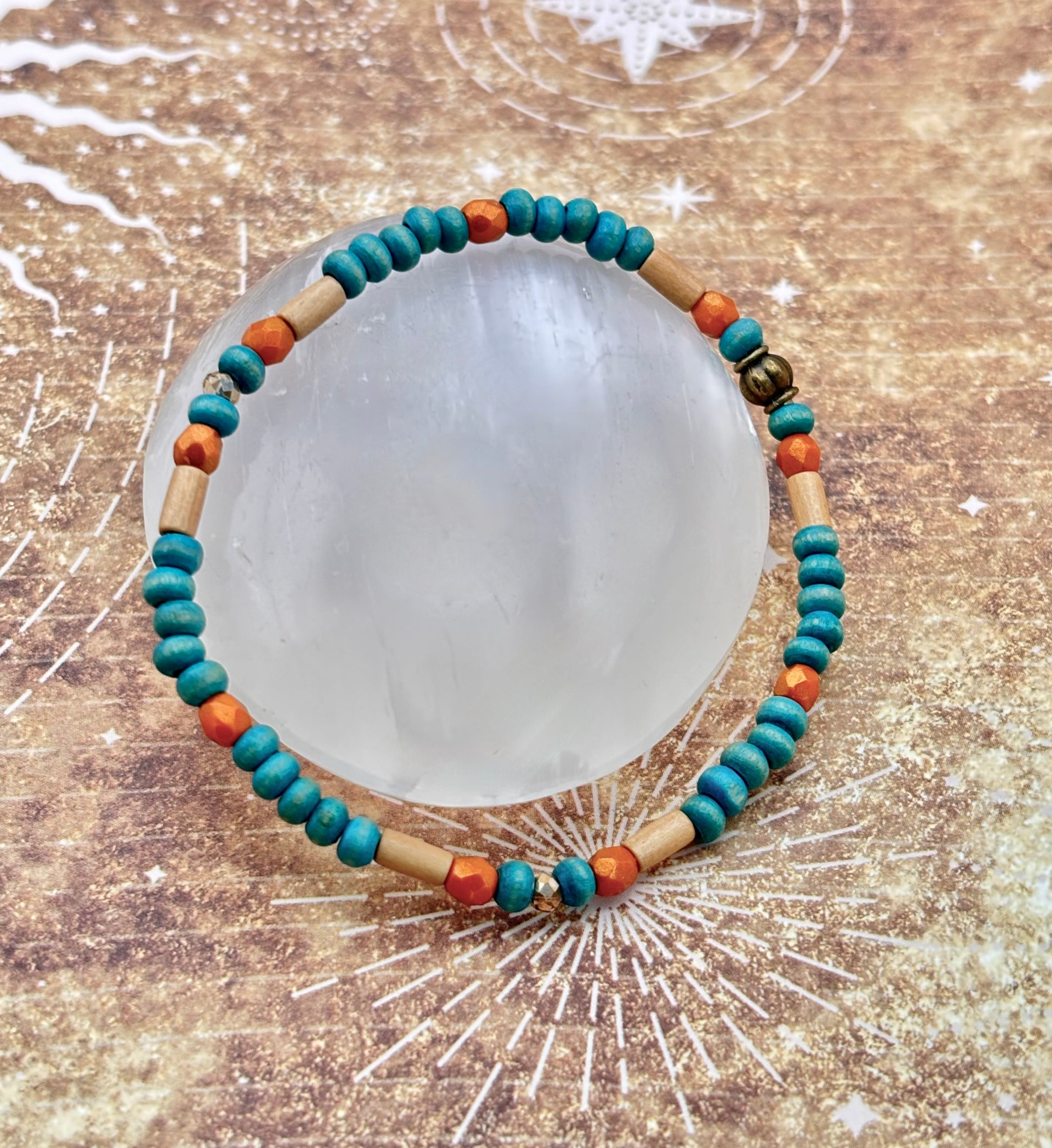 If Jupiter were a world you could walk on, imagine the view: swirling skies of turquoise, orange, and cream, with roaring winds whispering secrets of endless adventure. Jupiter Skies channels that same expansive energy, blending turquoise-hued beads, natural wood, and fiery Czech glass accents into a bracelet that inspires freedom, courage, and authentic self-expression.