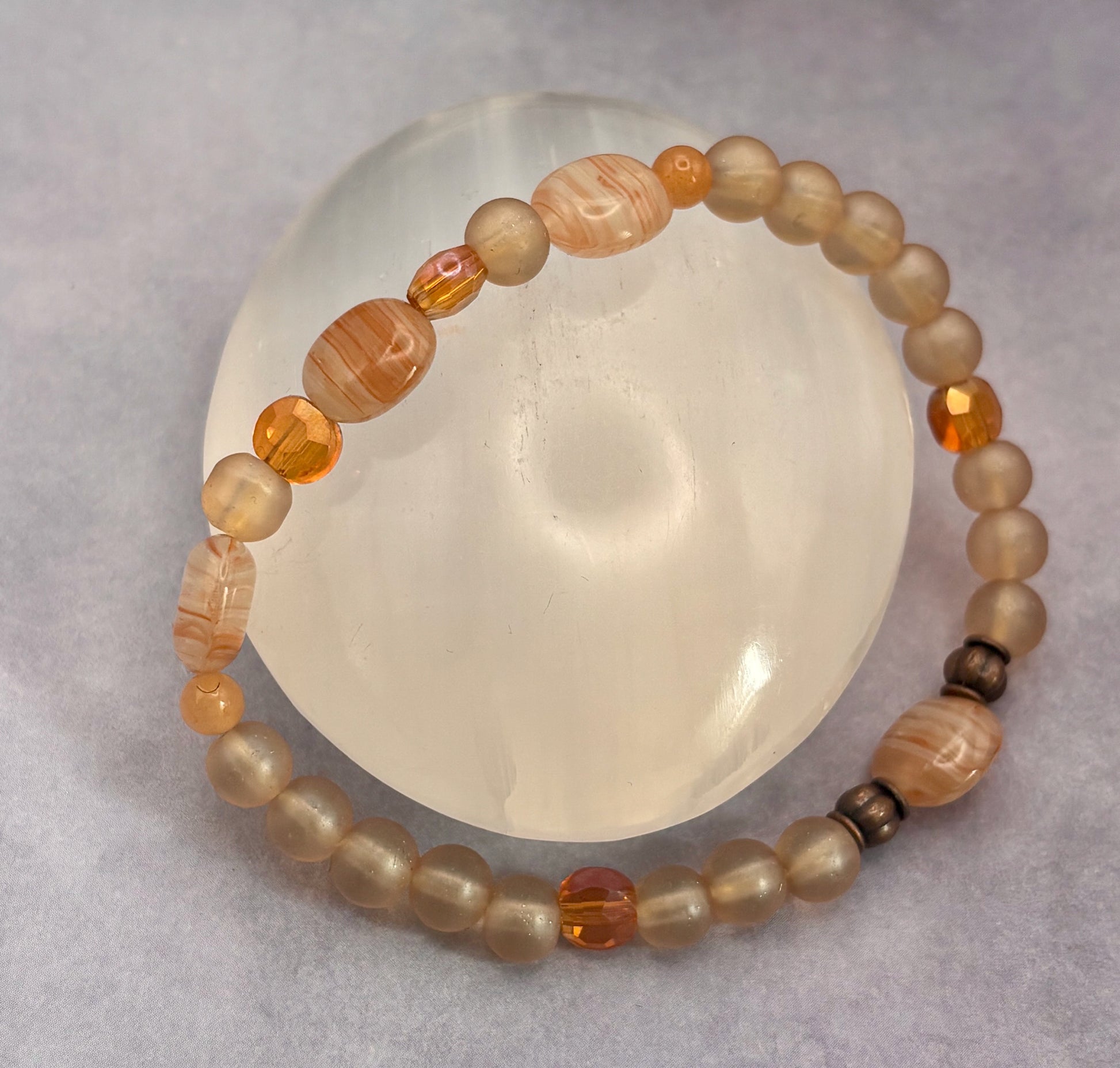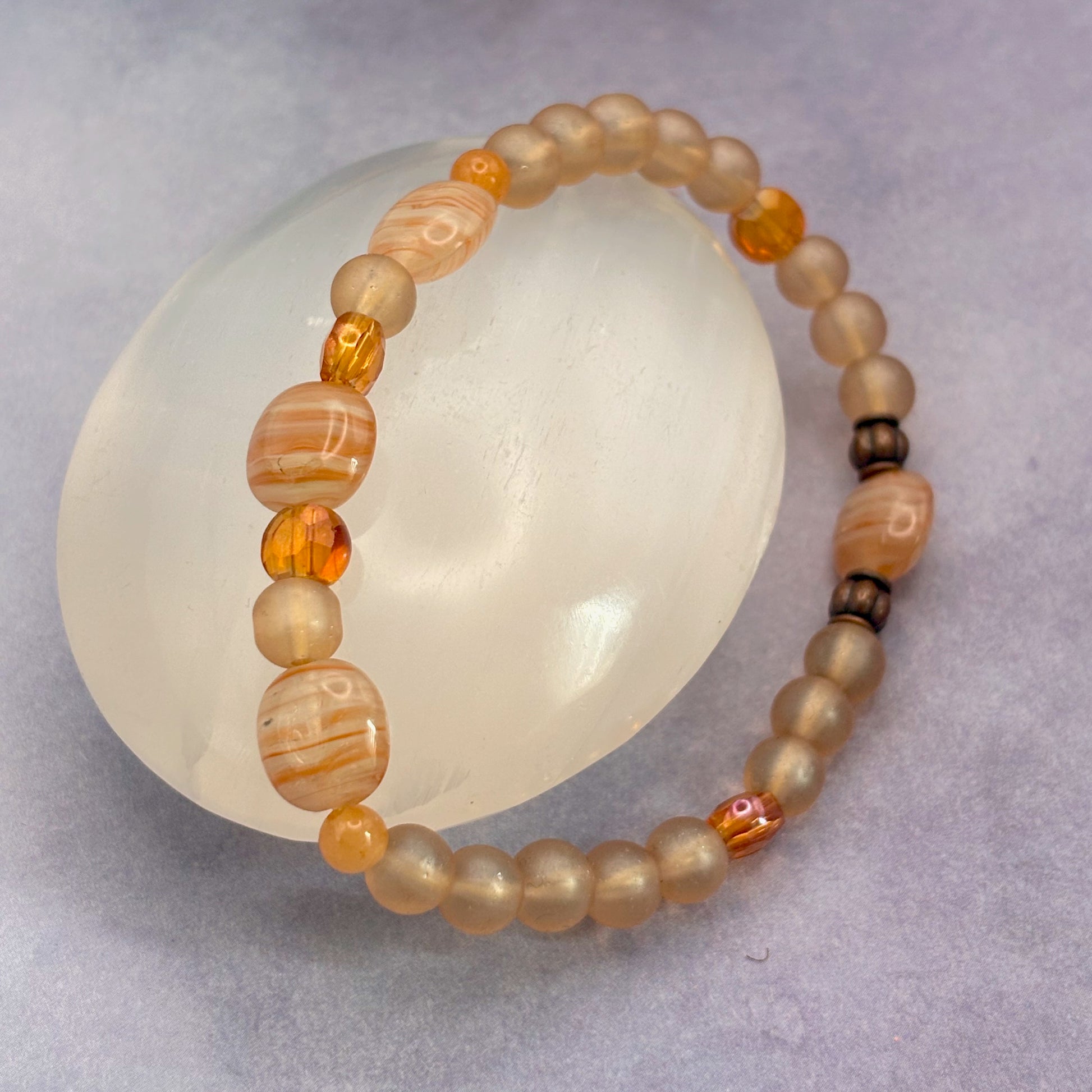Soft as golden hour and sweet as sun-warmed stone fruit, Late Summer glows with honeyed glass beads and amber tones. The gentle shimmer and swirling patterning evoke those in-between moments—when time slows, warmth lingers, and everything is ripening in stillness. With antique copper accents grounding the light, this bracelet invites ease, sweetness, and sensual presence.