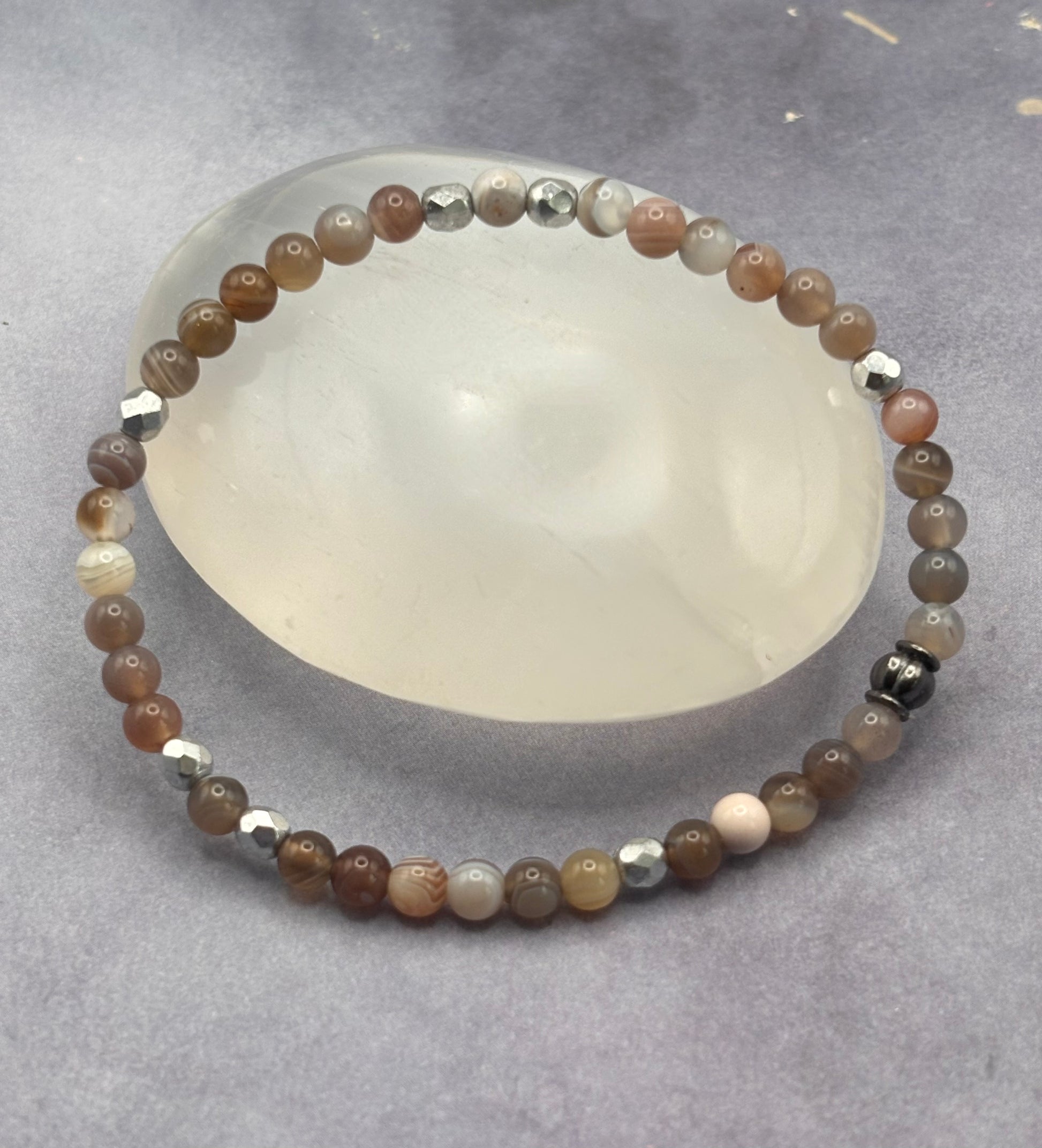 Pause. Breathe. Reset. Midday Meditation is your reminder to step away from chaos and return to clarity. Featuring the serene beauty of Botswana Agate accented with metallic tones, this bracelet transforms tension into balance and frustration into focus.