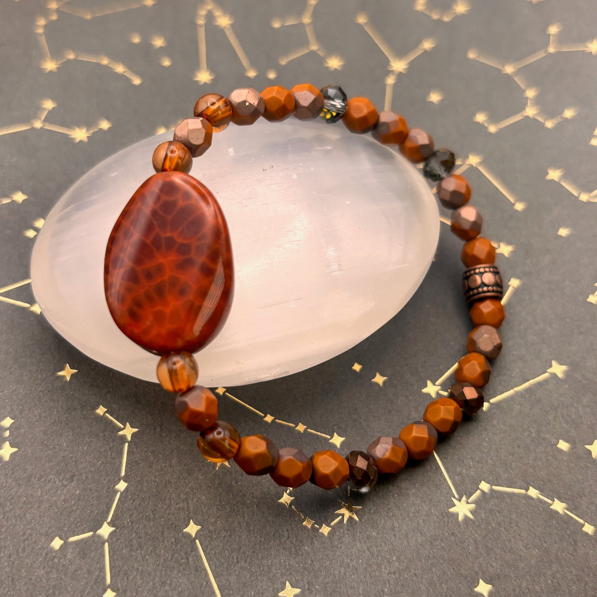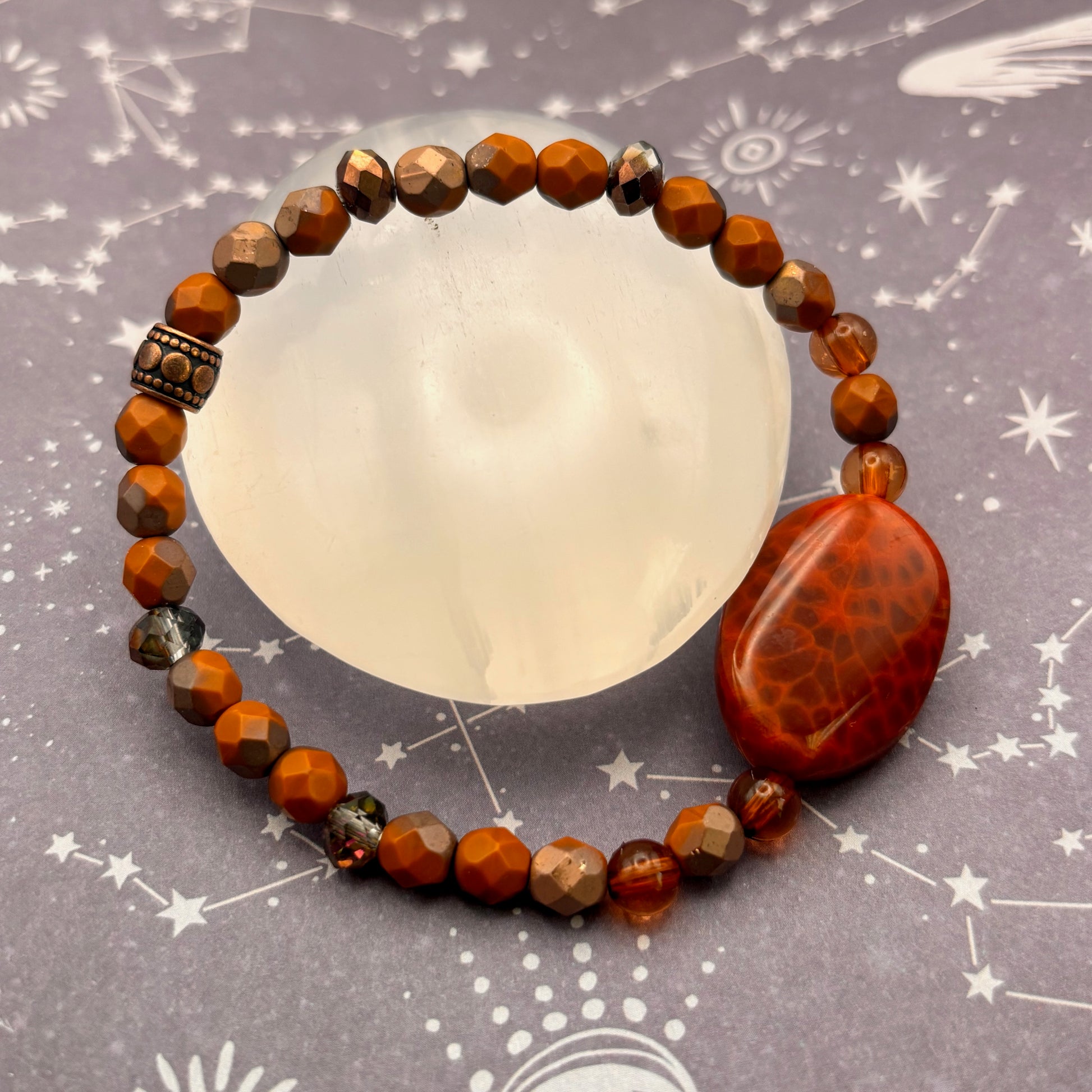 Fiery, resilient, and unstoppable, Molten Path is the embodiment of courage in motion. At its core, cracked fire agate burns with ember-like patterns—stones of protection, vitality, and deep transformation—reminding you that true strength is forged in life’s most intense moments. Matte fire-polished Czech glass in warm orange tones carries the heat of momentum, while bronzy translucent rondelles flow like molten earth, grounding the flame without dimming its glow. A single copper accent anchors the energy, adding stability and the wisdom to channel passion into lasting purpose.