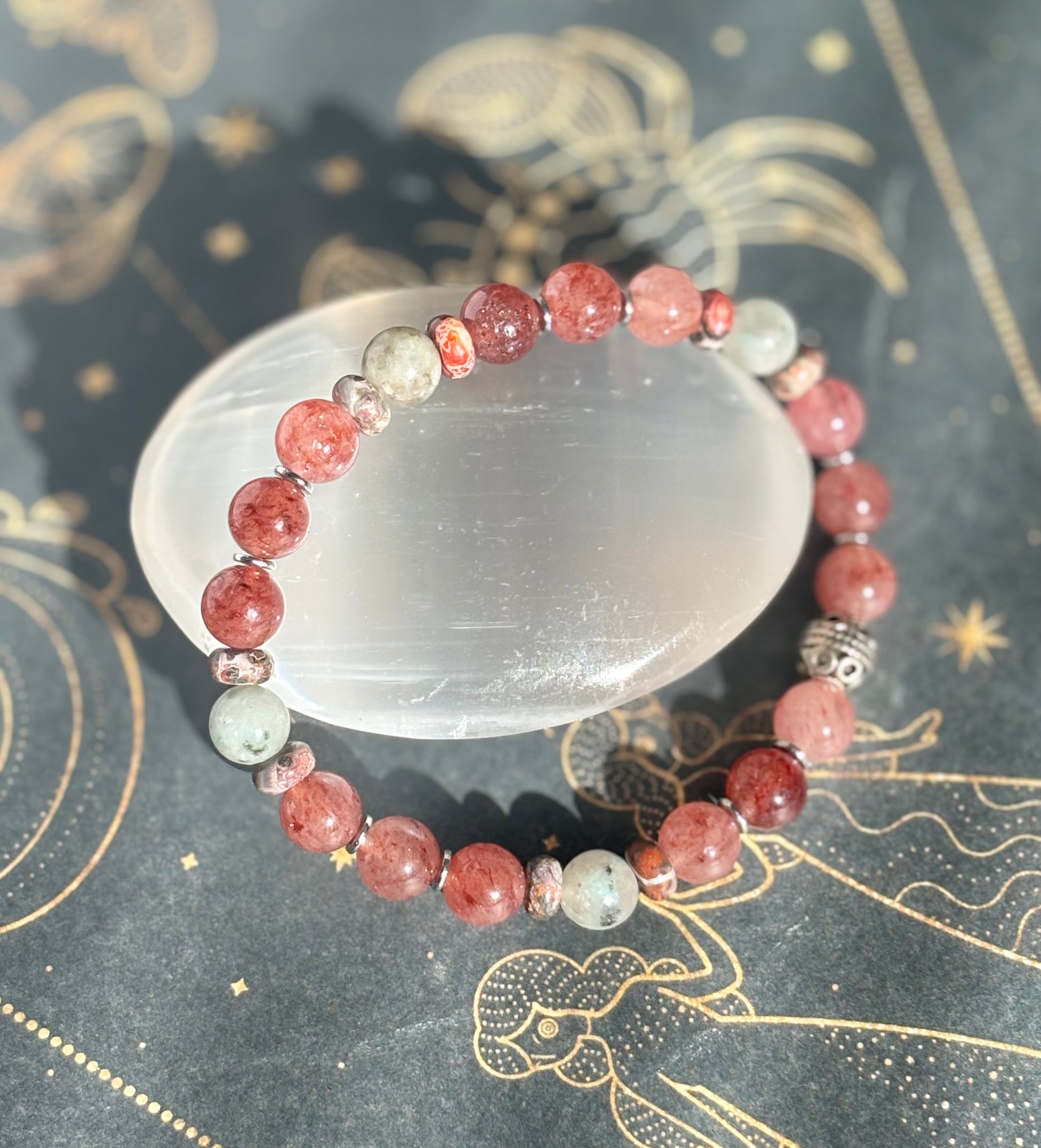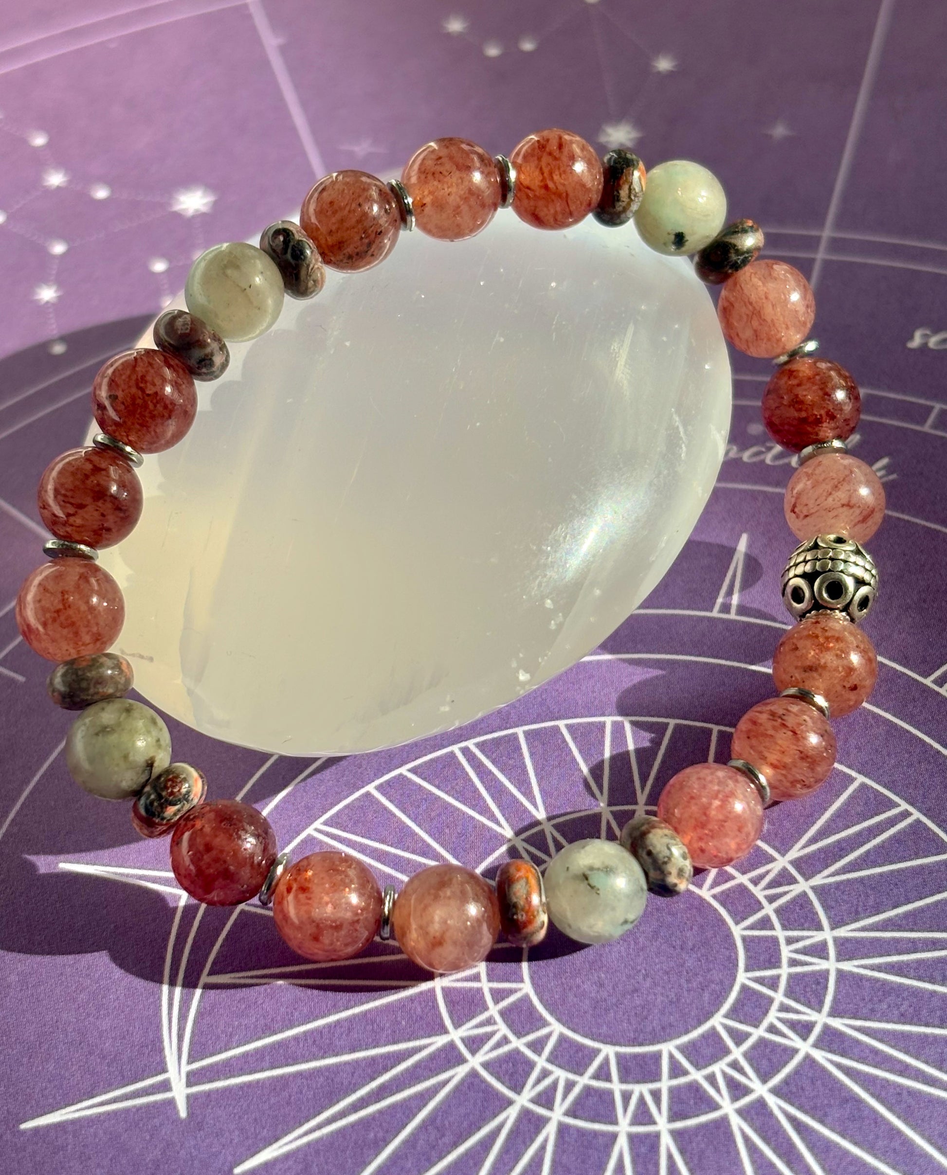 Strawberry Quartz lifts awareness and removes what no longer serves you, while Kiwi Jasper keeps you grounded and balanced. Leopardskin Jasper adds strength for life’s transitions, encouraging creativity and resilience as you step into your highest potential.