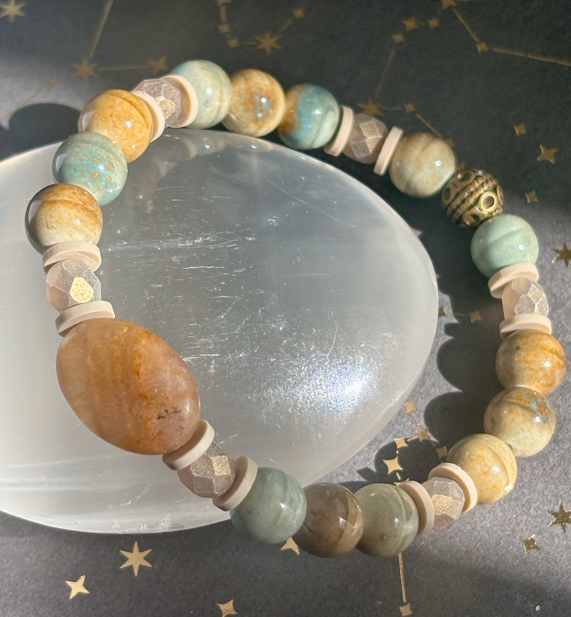 Soft terracotta, sea-mist green, and earthy taupe dance together in Naturally Free, a bracelet that channels grounding serenity with a whisper of wild freedom. Ceramic beads carry the essence of Earth’s steady heartbeat, while frosted bronze Czech glass and creamy polymer accents add an organic, tactile warmth. At its center rests golden-brown fluorite, a stone known for clarity and direction—a compass for both mind and soul. Together, these elements form a talisman of calm liberation, encouraging balance without confinement and structure without limitation.