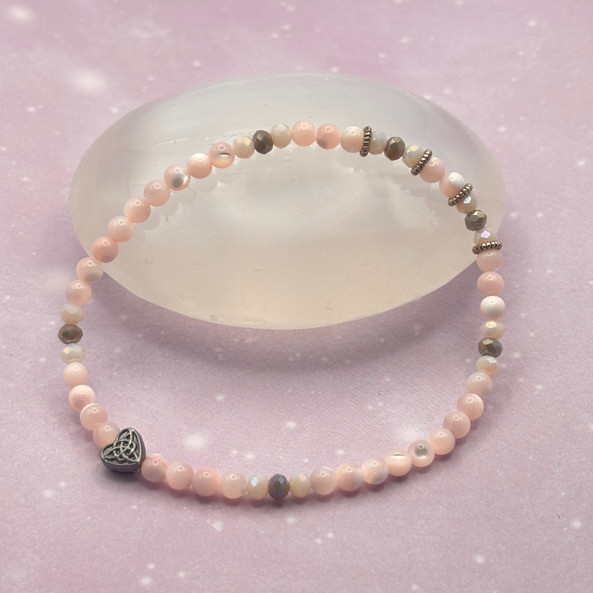 Mother of Pearl also brings protective energy, creating a shield against negativity while enhancing intuition and inner peace. Its soft pink tones radiate compassion, innocence, and the beauty of a fresh start.