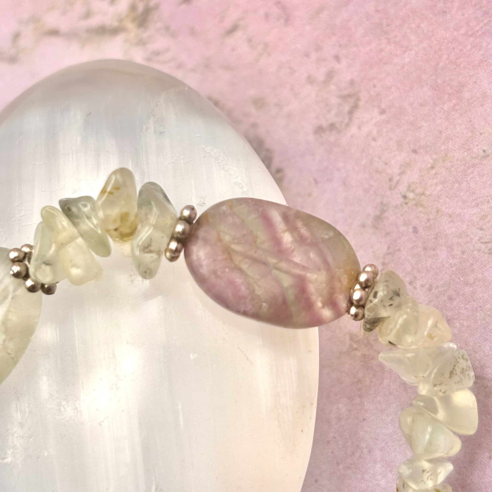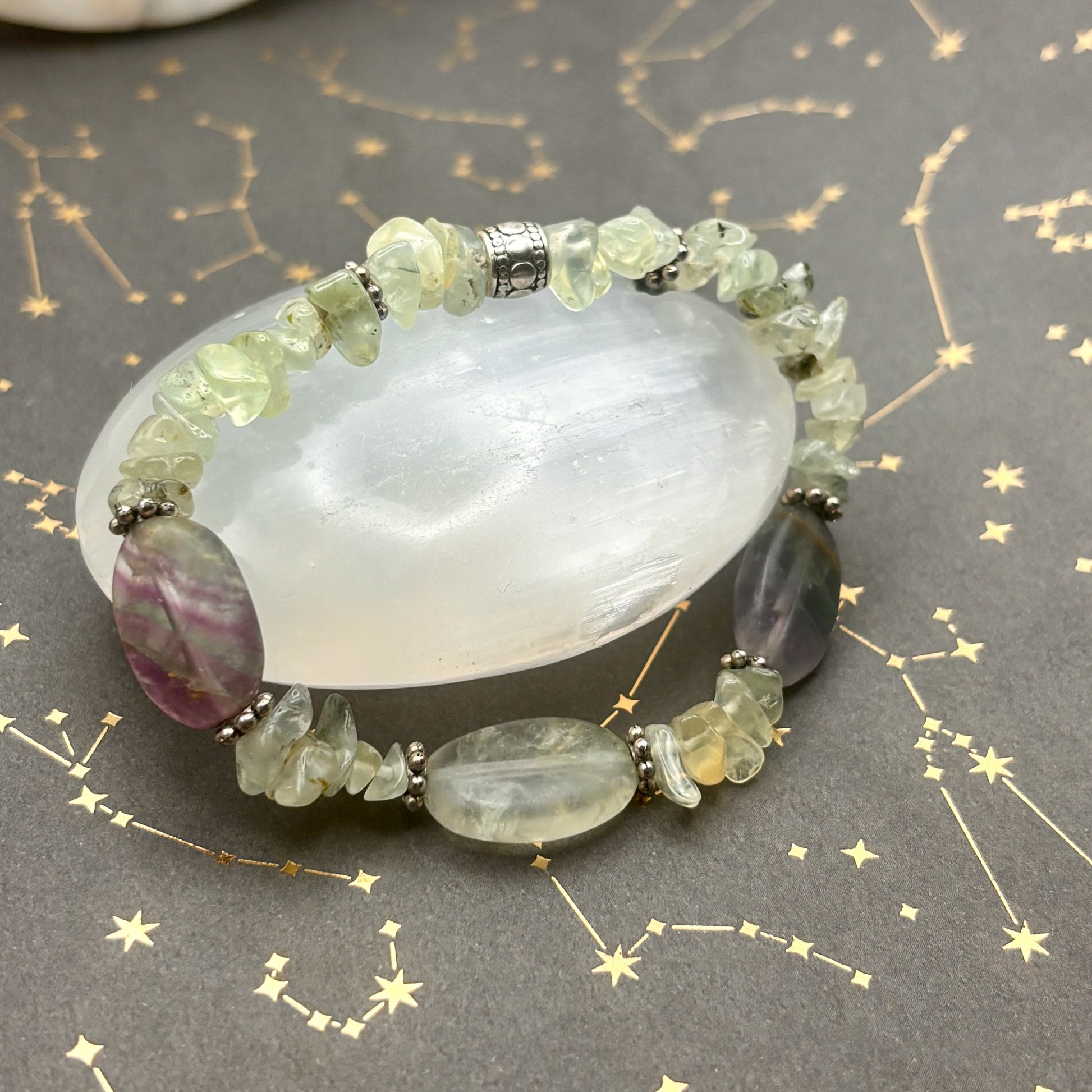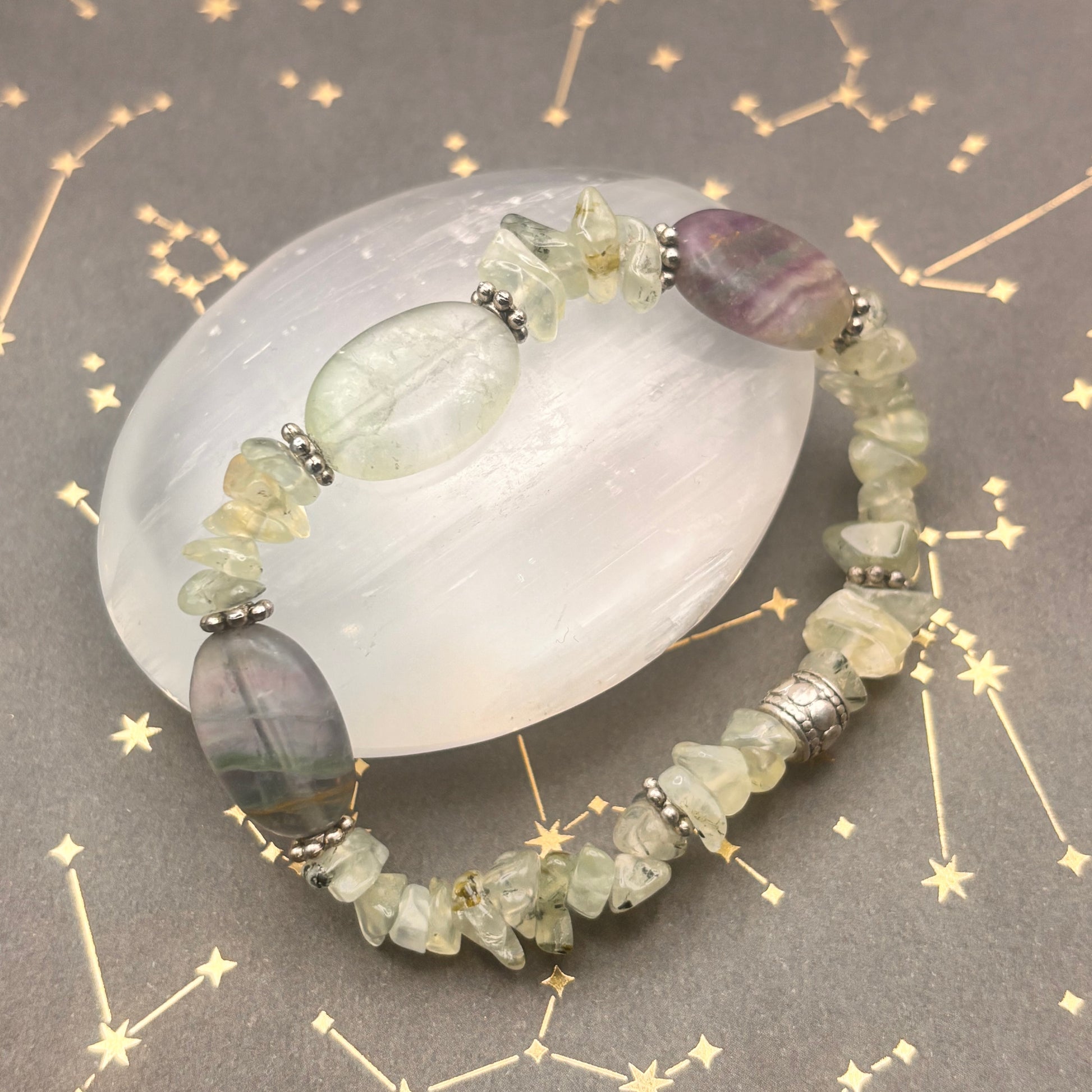 Like morning mist curling over ancient earth, this piece whispers of clarity after chaos. Soft prehnite chips flow around the wrist like running water, gently cleansing and aligning the heart’s wisdom with the soul’s direction. At its core, three smooth fluorite tabs anchor the design — green, clear, and purple hues that hold the vibration of intuitive growth and conscious evolution.