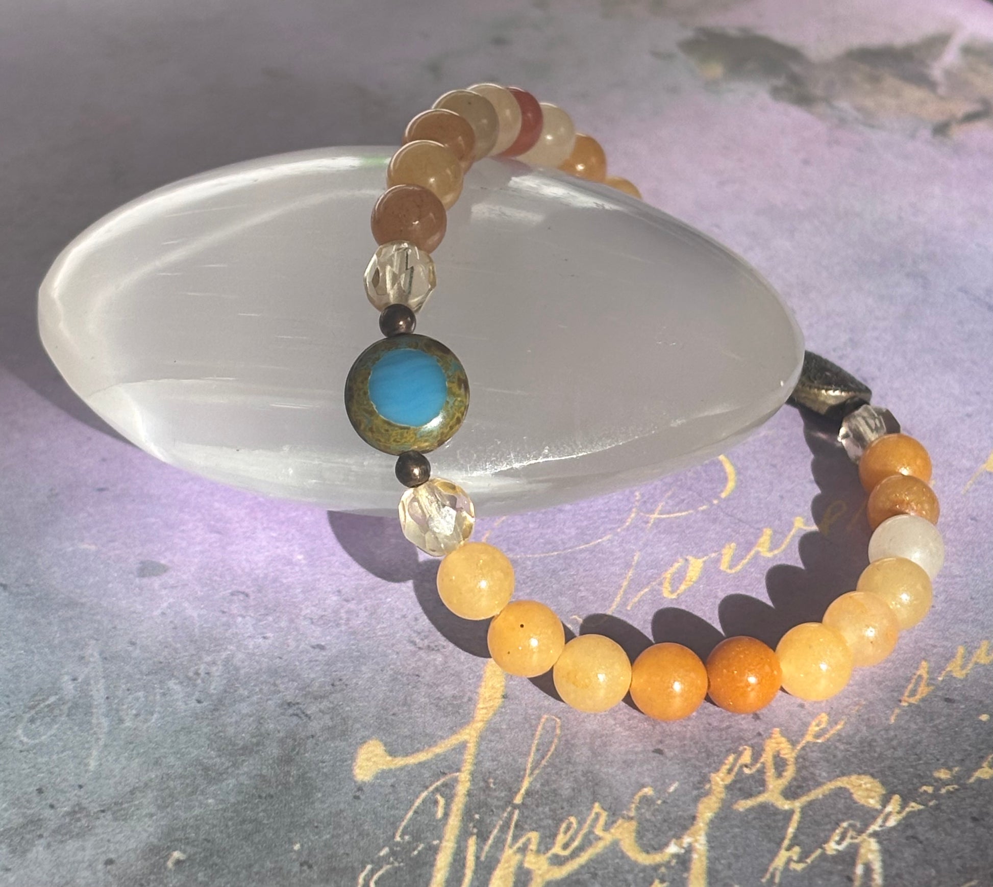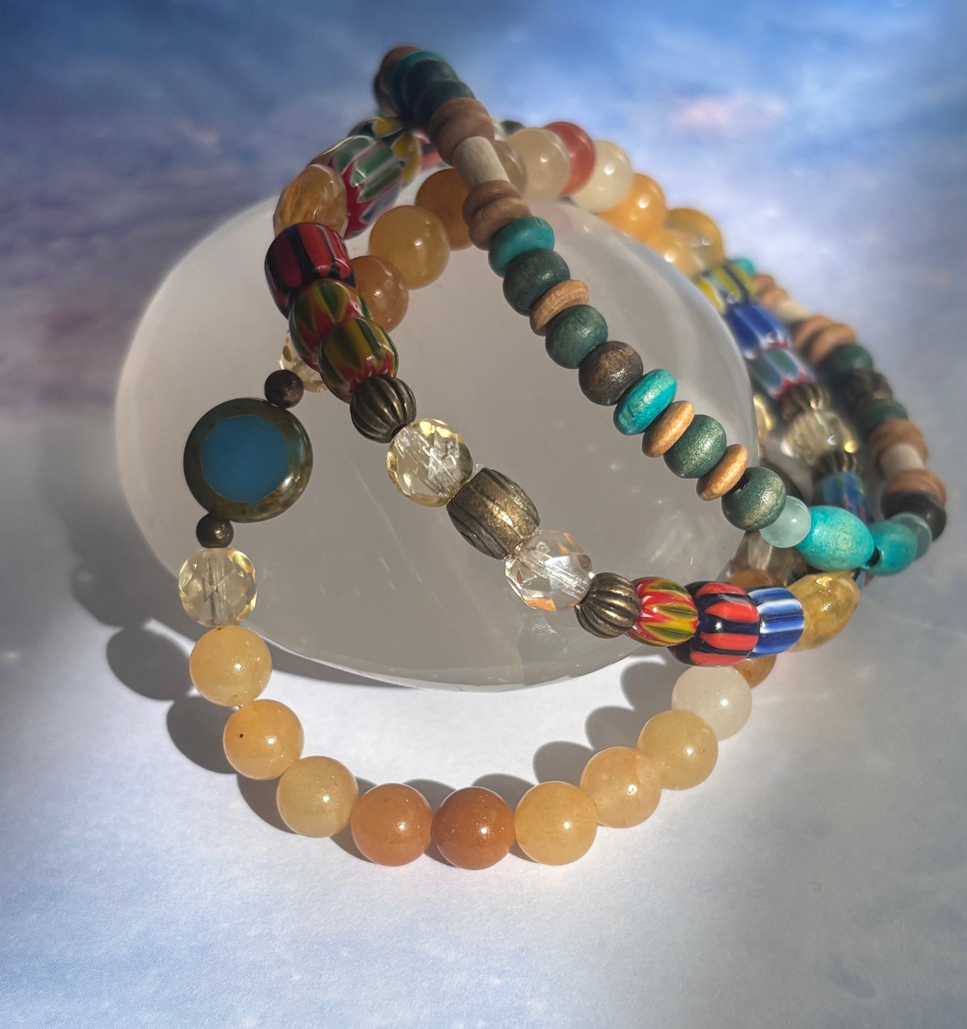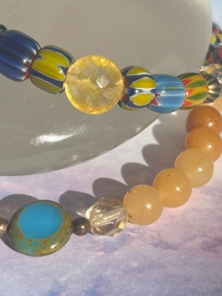 Use this combination to show your unique style. Feeling colorful? Bring in the adventurous, enthusiastic and jovial energy that Sagittarius is known for. The combination or oranges, reds, yellows and blues by way of agate, citrine, wood, czech and handblown glass will add flair to any wrist willing to take the risk!