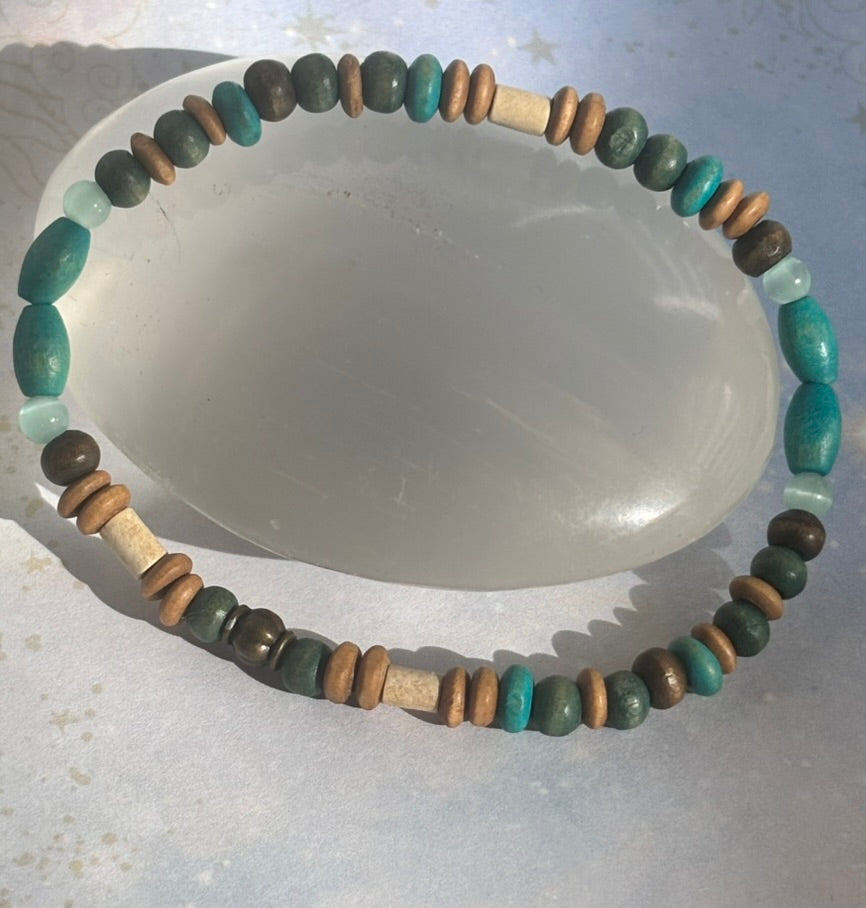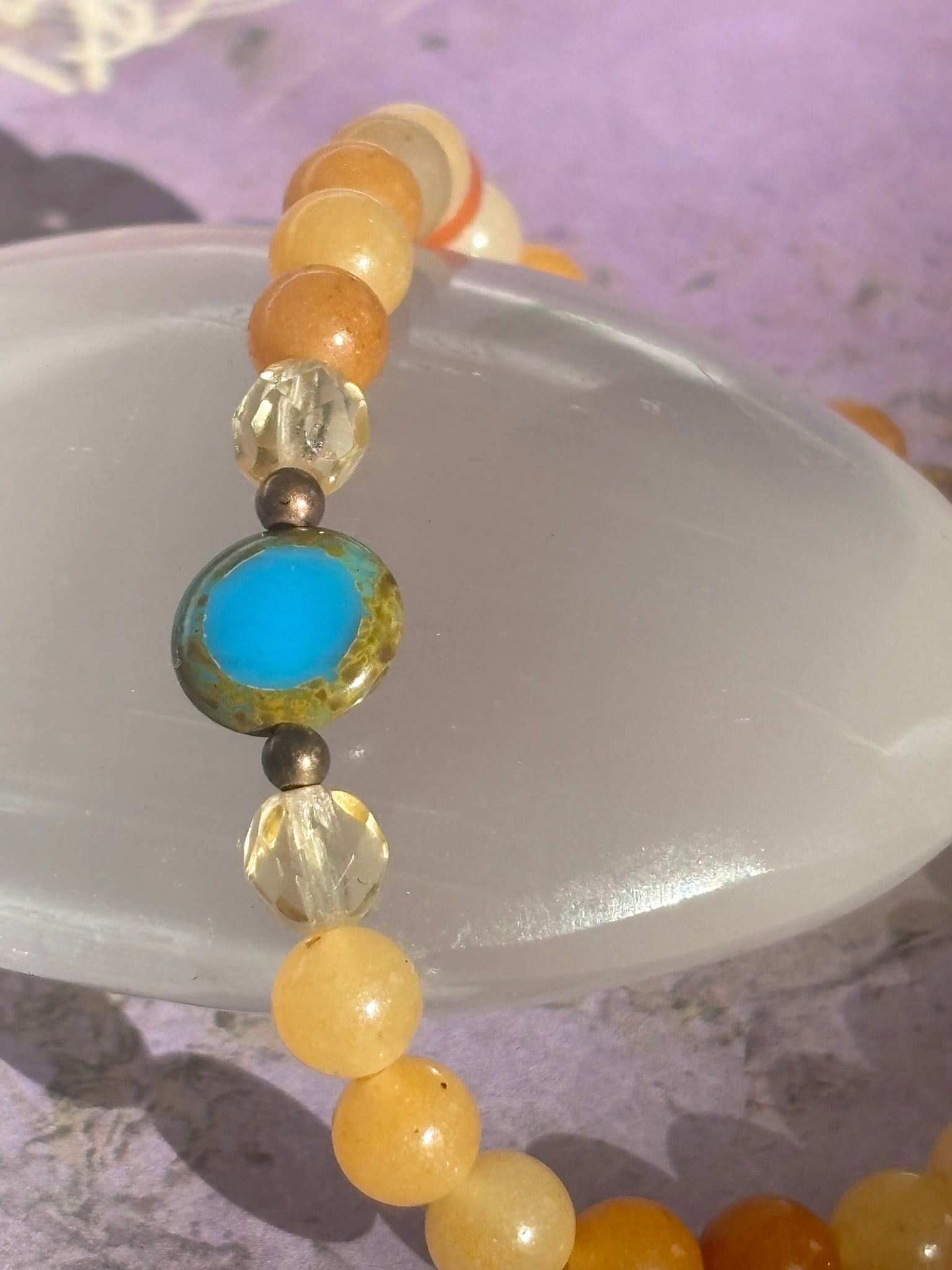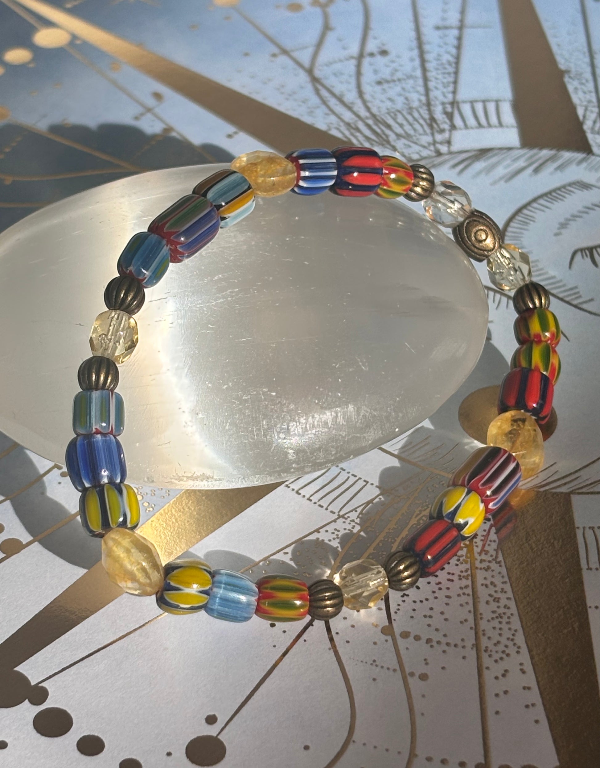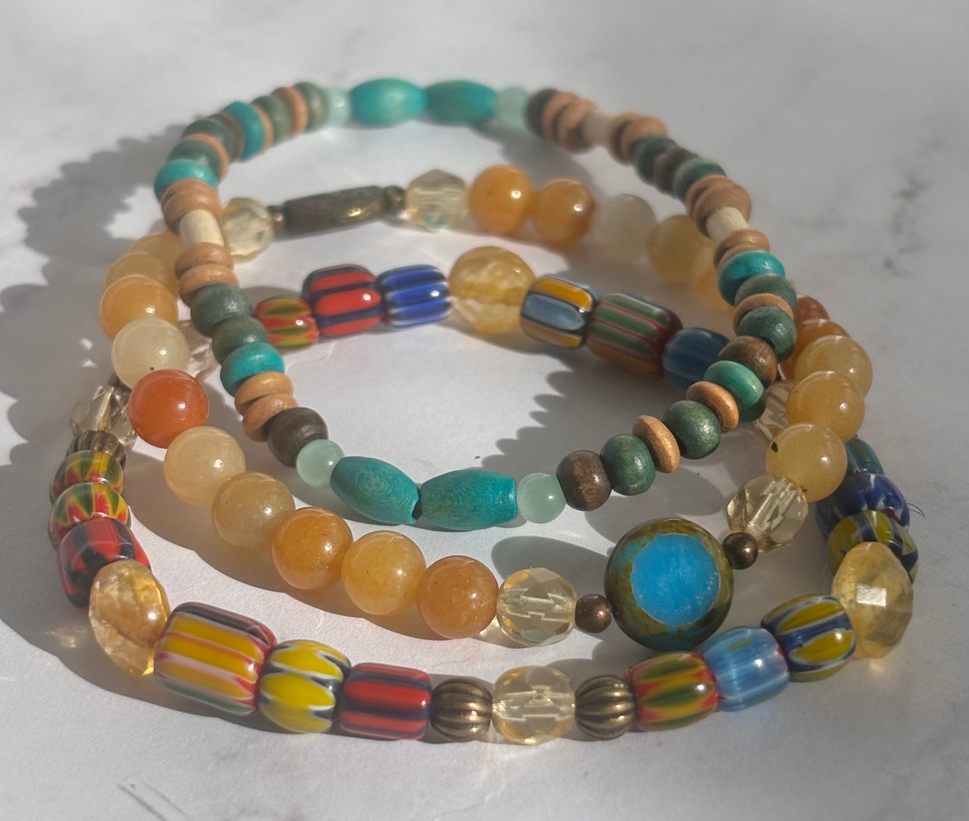Use this combination to show your unique style. Feeling colorful? Bring in the adventurous, enthusiastic and jovial energy that Sagittarius is known for. The combination or oranges, reds, yellows and blues by way of agate, citrine, wood, czech and handblown glass will add flair to any wrist willing to take the risk!