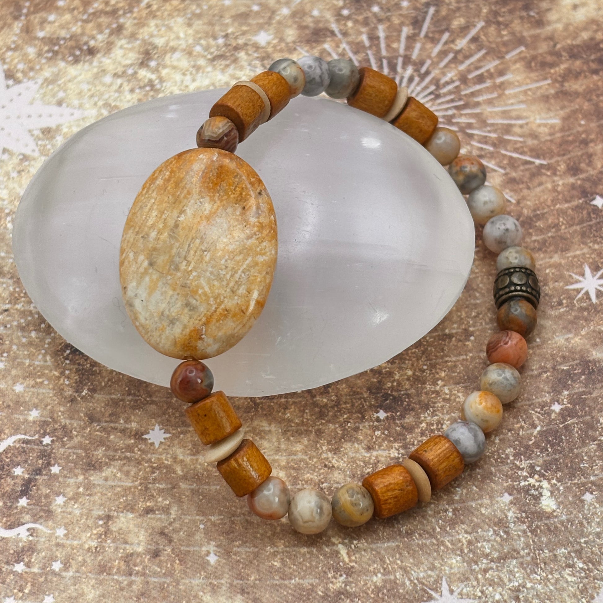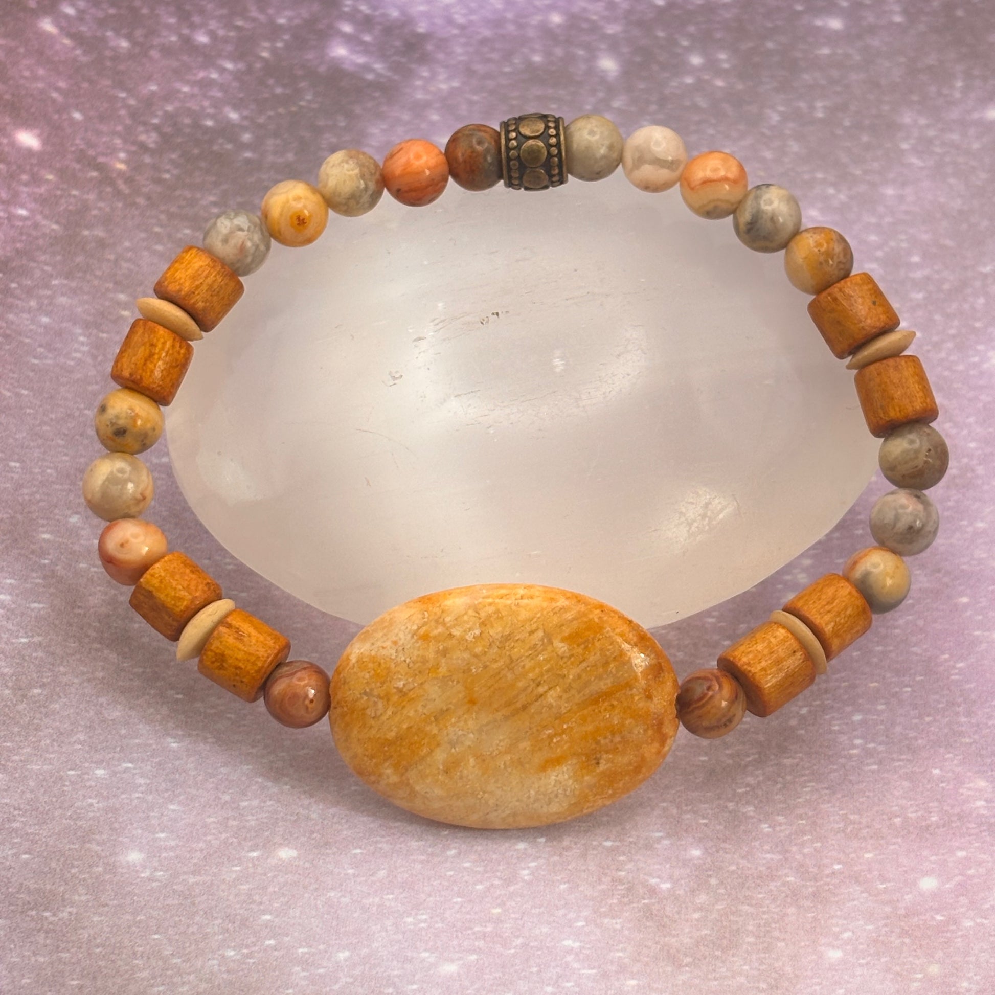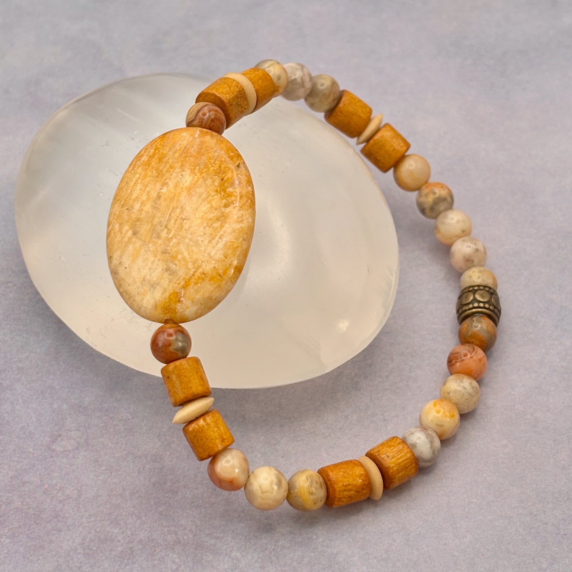 Grounding, adaptable, and quietly inspiring, Scenic Route is a talisman for embracing the beauty of the journey. At its heart, fossilized coral holds the memory of ancient seas and shifting tides, offering emotional balance, patience, and the wisdom of deep time. Picasso jasper swirls in earthy patterns, encouraging creativity, transformation, and a deep appreciation for life’s evolving landscapes. Smooth wooden beads bring the grounding energy of forest and root, anchoring your spirit in the present as you move forward.