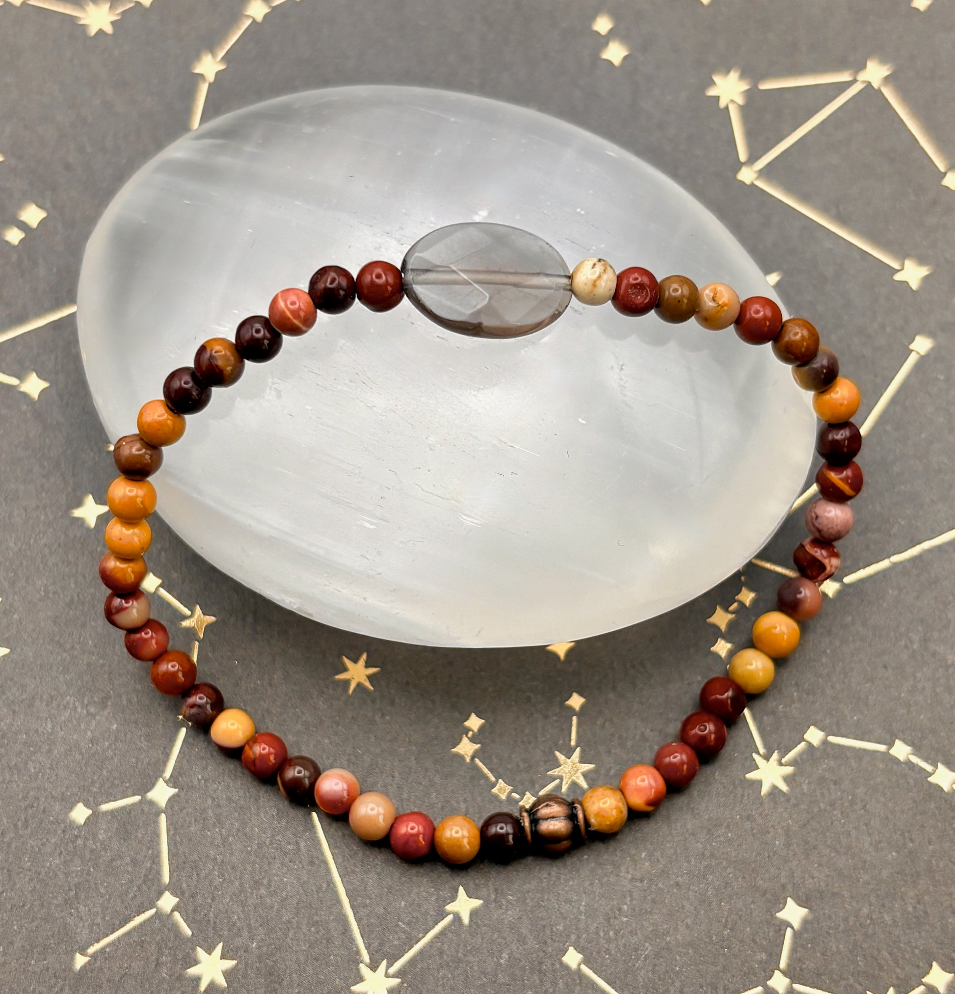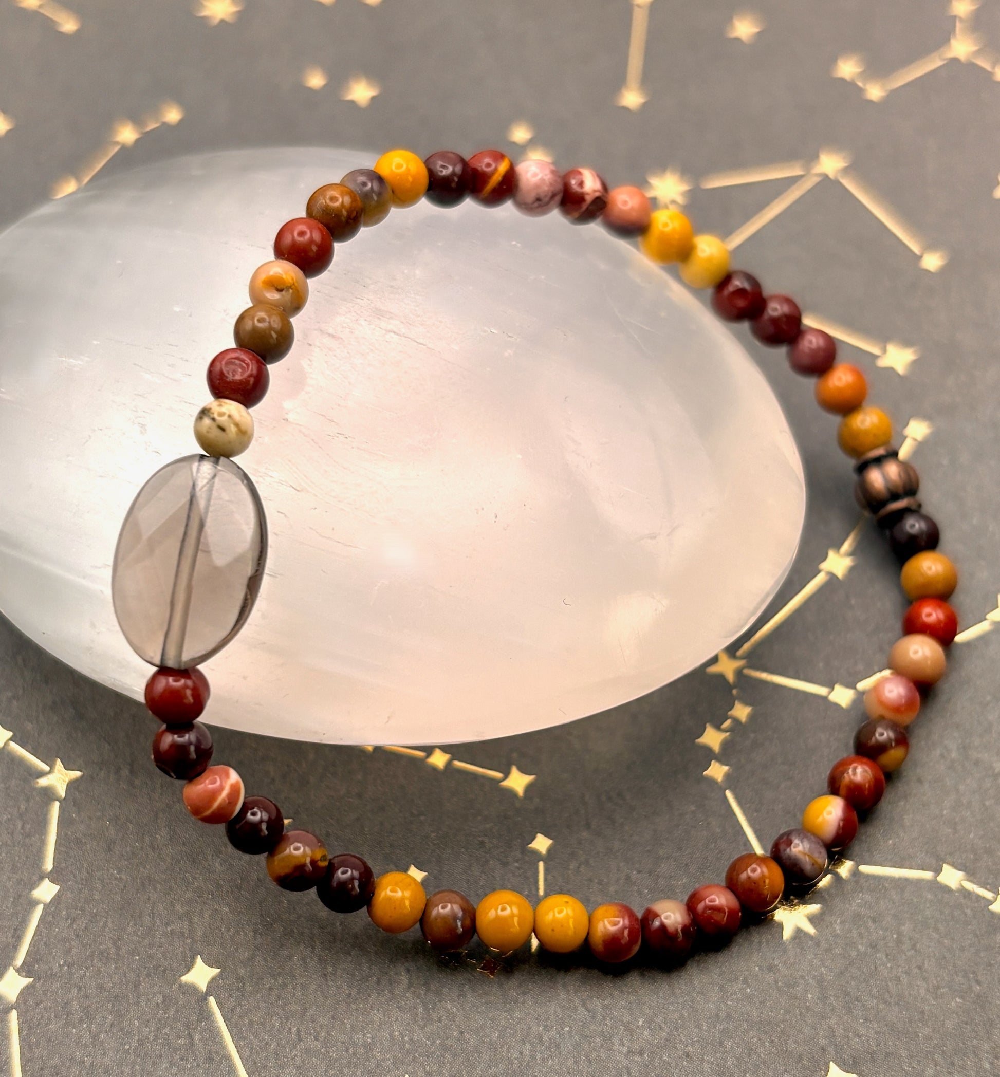 Smoky quartz channels the stabilizing energy of Earth, grounding heightened awareness so it can be used with purpose. Mookaite bridges Earth’s patience with Fire’s vitality, awakening the courage to follow the path your intuition reveals.