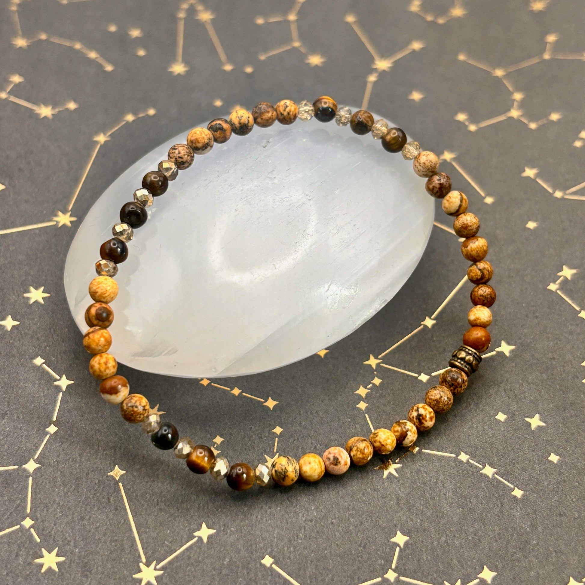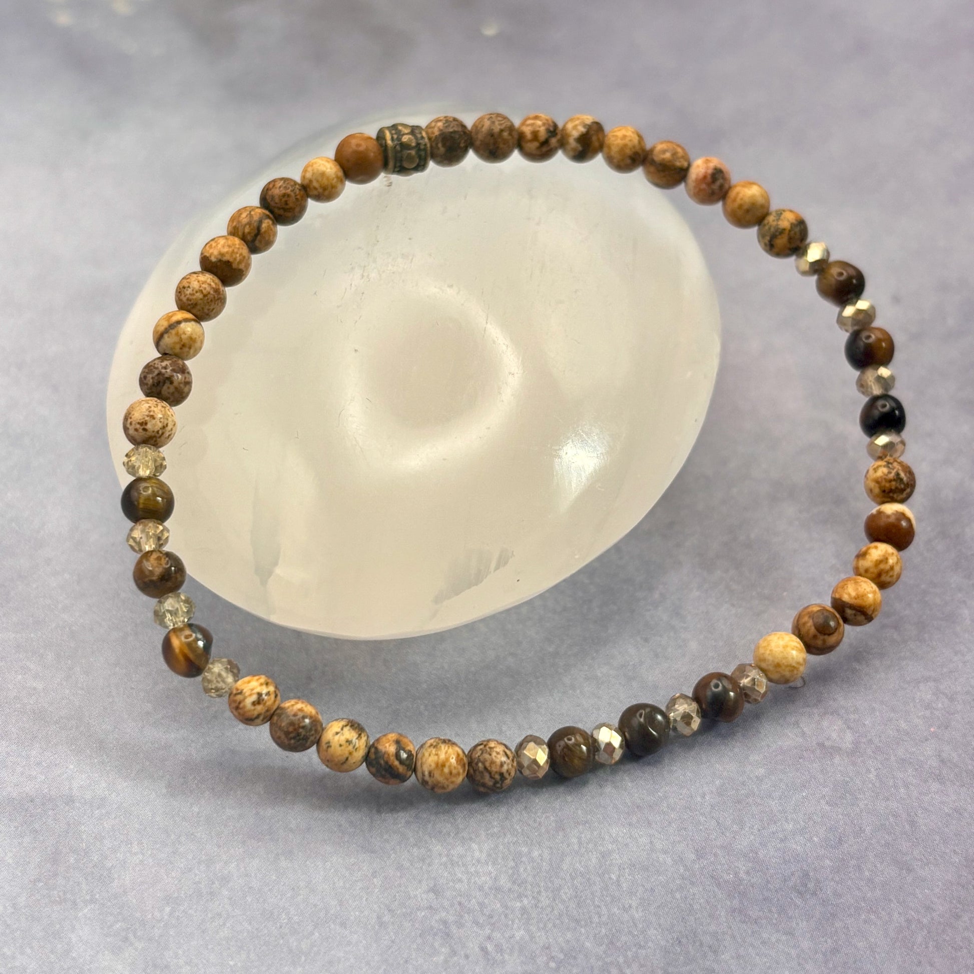 Picture jasper, with its natural marbling and desert landscape hues, instills a sense of wholeness and connection to the Earth. It’s a stone of endurance, nurturing a patient and grounded approach to growth. Tiger eye, flickering like sunlit soil, lends strength, clarity, and discernment when you're standing at life’s crossroads. And just a glimmer of Czech glass sparkles like dew on stone — a touch of beauty amidst the steadfast.
