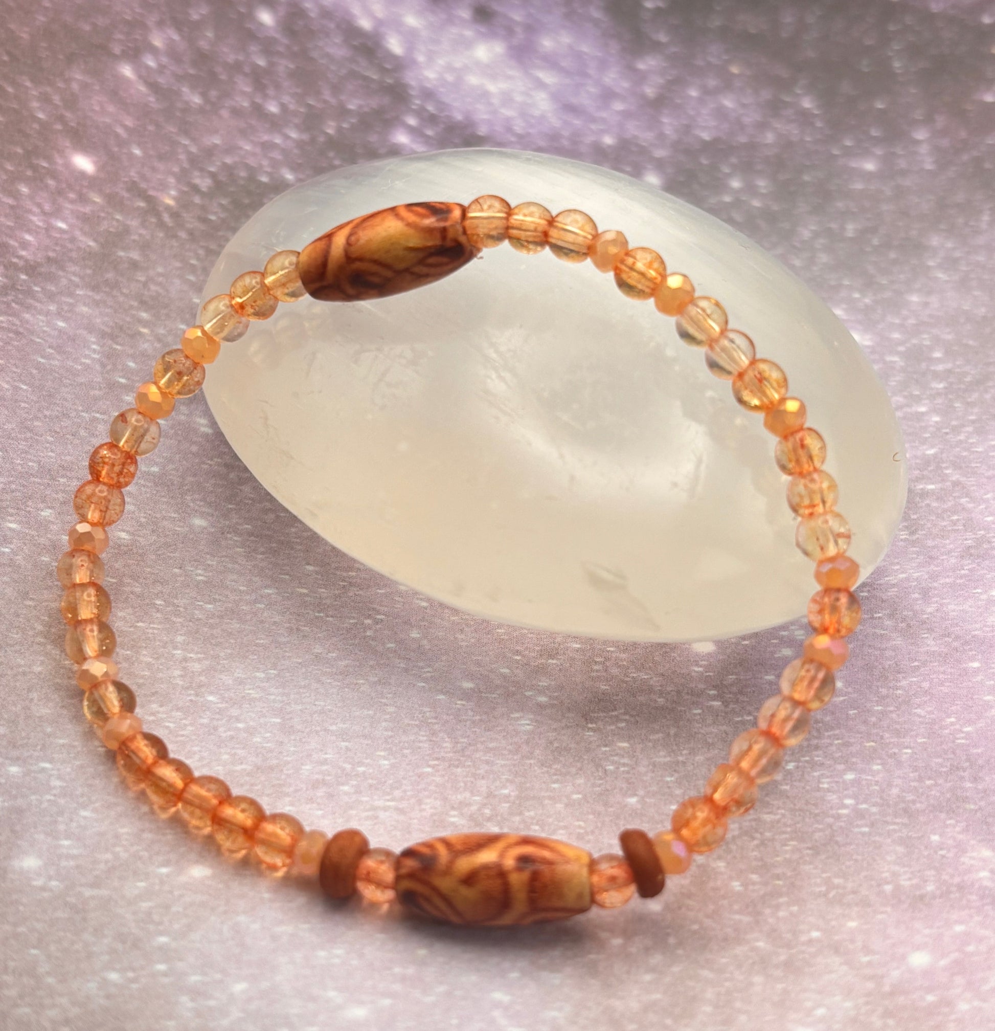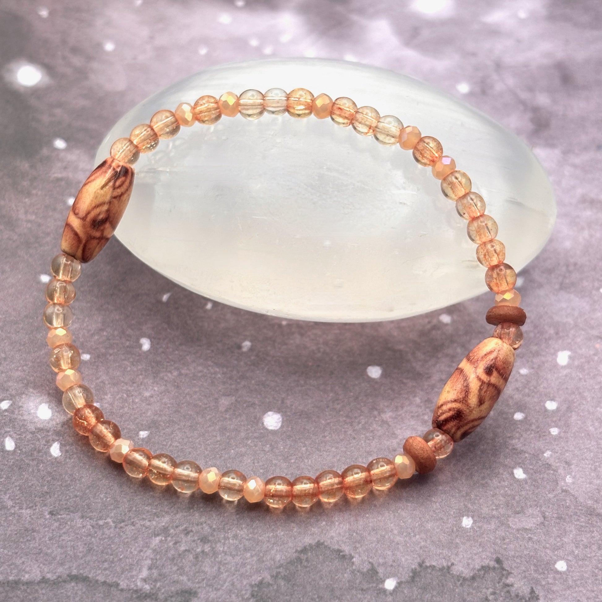 Warm, grounded, and quietly radiant, Terracotta Light carries the glow of a sun-warmed horizon into your day. Dyed quartz shimmers in soft amber and peach, channeling Fire’s uplifting spark to inspire joy, balance, and renewed vitality. Printed wood beads evoke the calm strength of sun-aged wood, holding the grounding wisdom of Earth, while antique copper accents add the resilience of time and tradition.