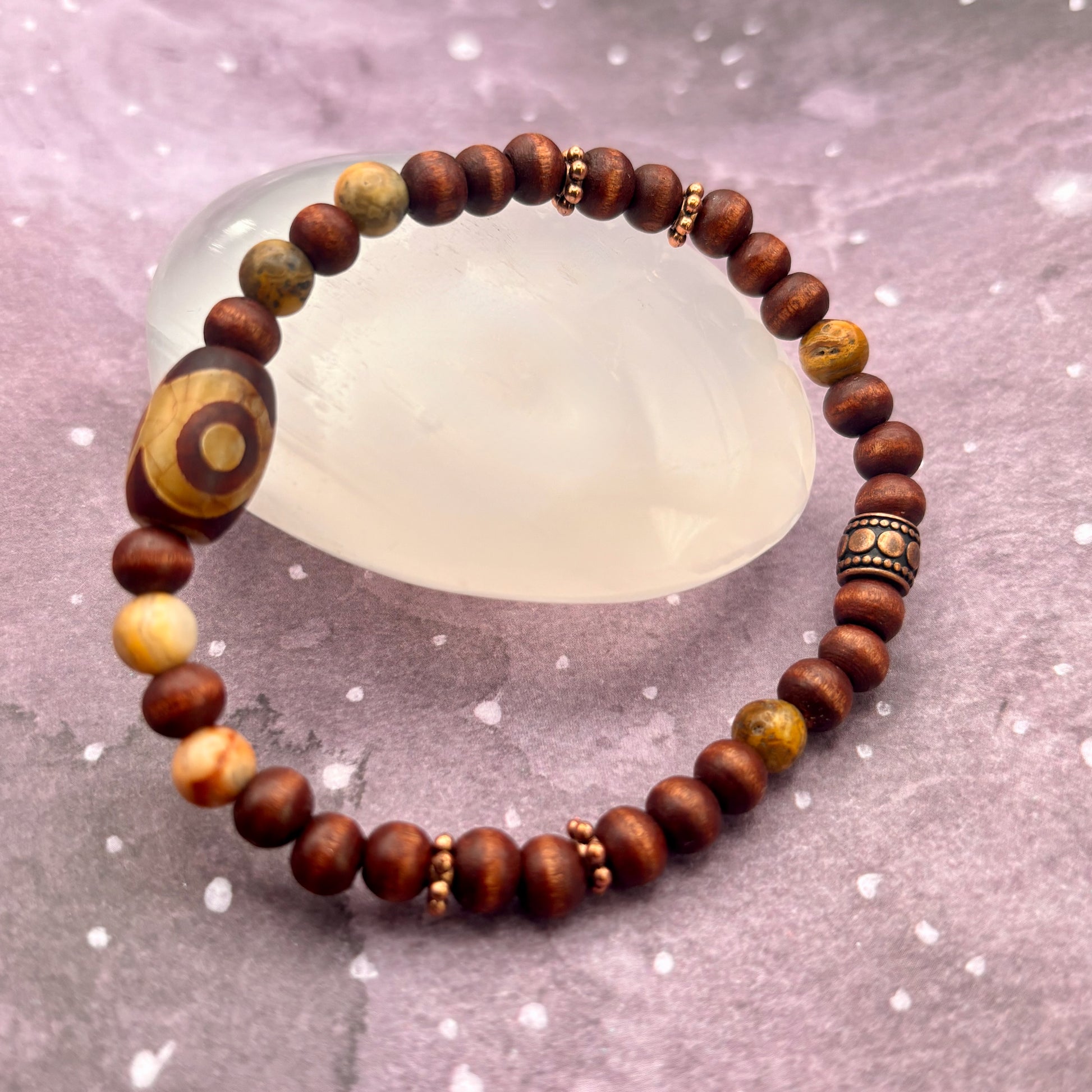 Grounded, protective, and quietly transformative, The Way Home is a steady compass for life’s many turns. Smooth wooden beads root you in the natural world, offering calm and stability, while picasso jasper sparks creativity, adaptability, and a deep appreciation for each twist and turn along your journey. At its center, a Tibetan agate bead serves as a powerful talisman of protection and insight, its ancient markings a reminder that all paths—no matter how winding—can lead you back to yourself. Copper accents thread through the piece, carrying resilience, endurance, and timeless warmth.