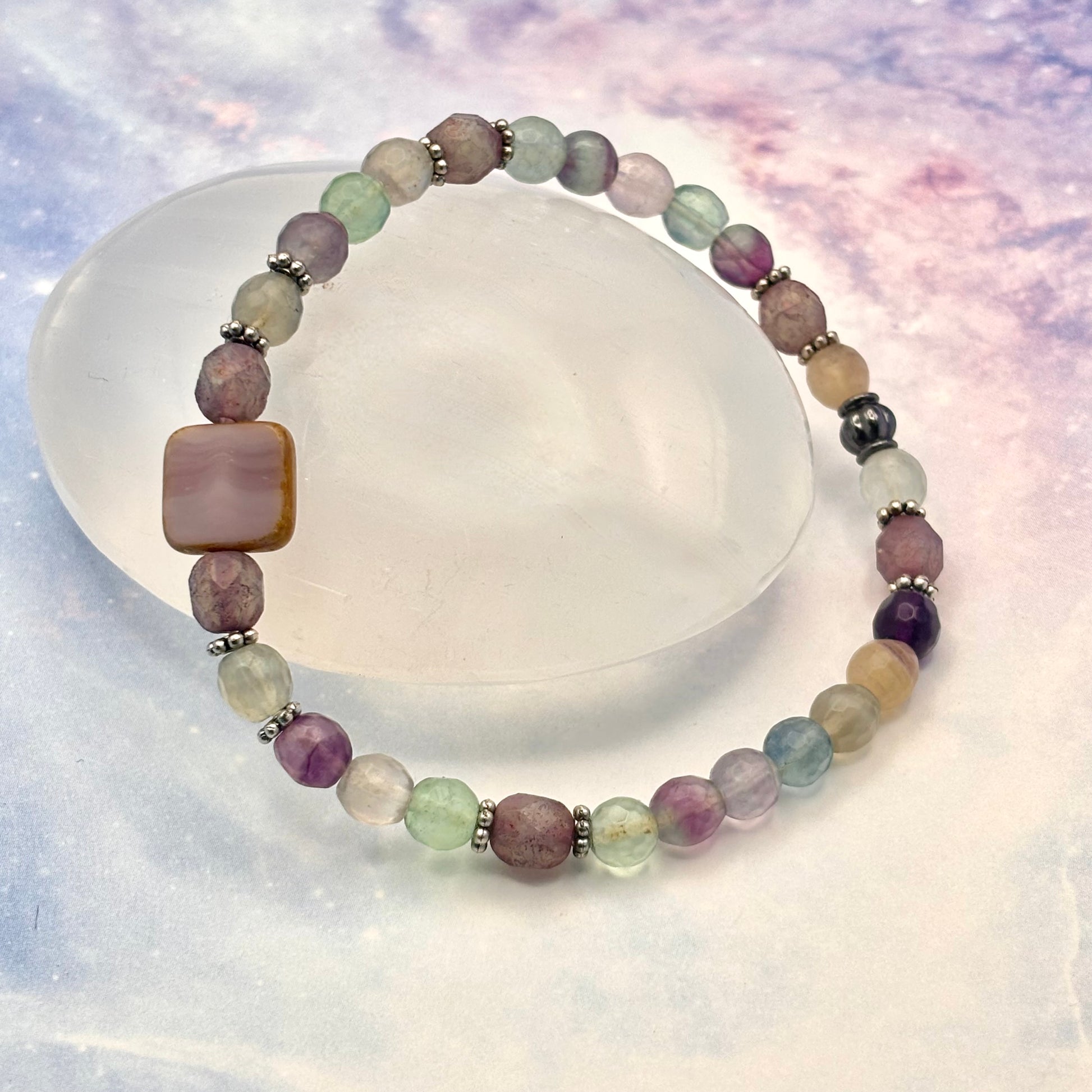 You are not your circumstance—you are a work in progress, always evolving. Transform is your ally in times of change, featuring the luminous energy of Rainbow Fluorite, a stone of clarity, focus, and spiritual alignment.