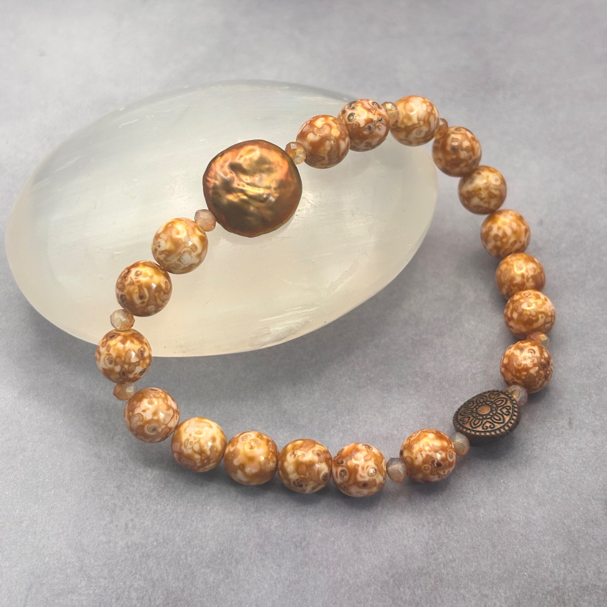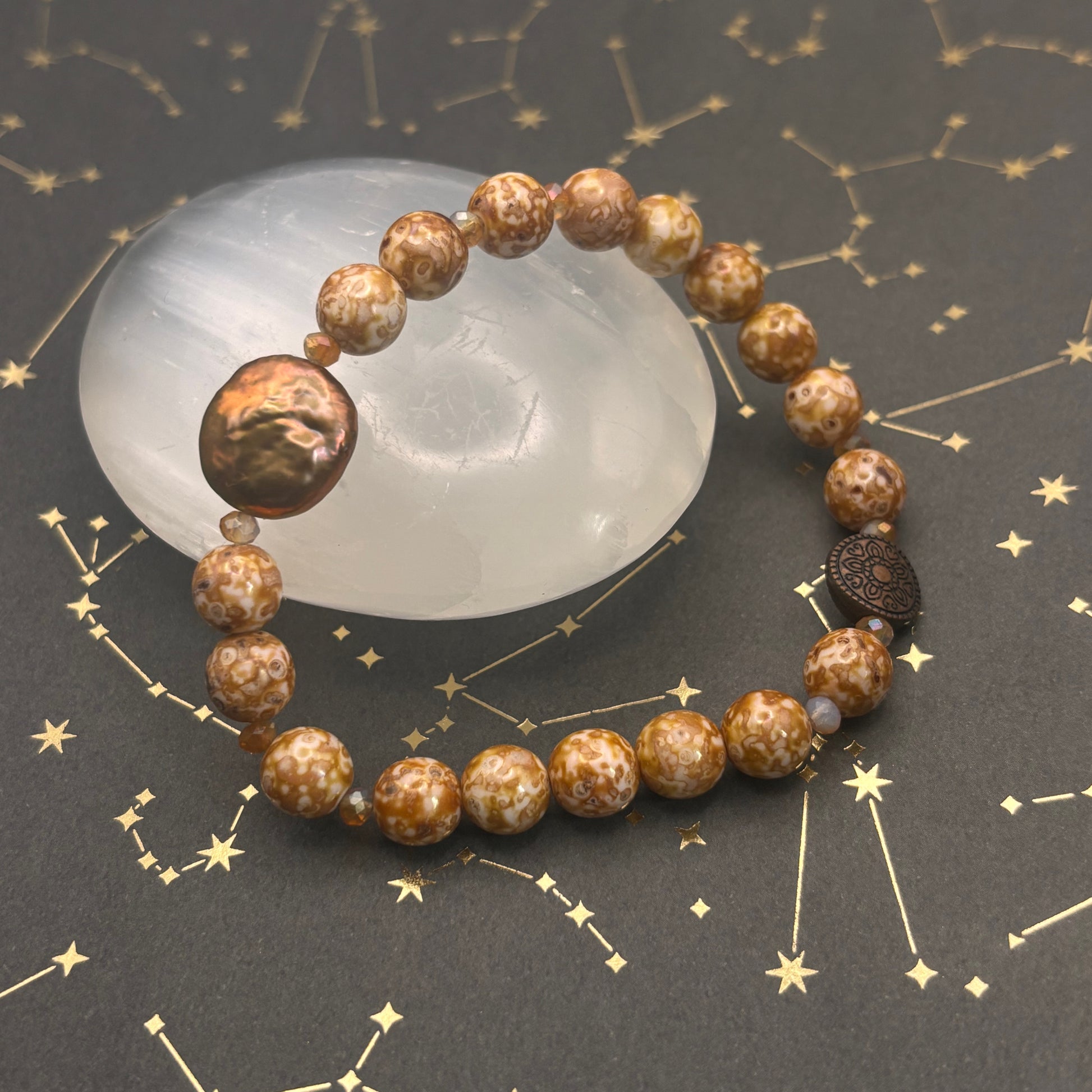 A kiss of warmth at the edge of the cosmos, Venusian Sunset is an ode to slow-burning beauty, serenity, and soft radiance. Swirling glass beads—like molten caramel clouds—capture the last light of a planetary dusk, while faceted Czech glass flickers like starlight on the horizon. At the heart lies a glowing Freshwater Pearl coin, luminous and gentle as Venus herself, radiating love, intuition, and feminine grace.