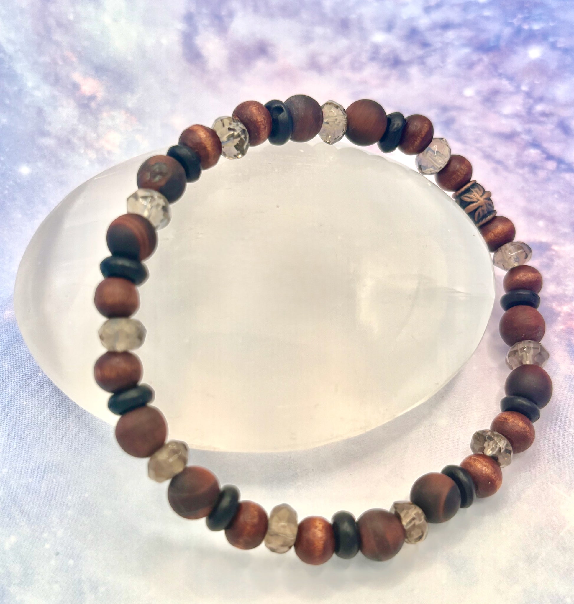 Strength is not loud—it’s steady. Ironwood Resolve embodies the quiet power that comes from standing firm in your truth. Deep, rich wood beads hum with earthy stability, while recycled Ghanaian glass brings a touch of ancestral wisdom and sustainability. Smoky Quartz, the stone of grounding and transmutation, clears negativity and reinforces focus. Matte Red Tiger’s Eye pulses with fiery determination, balancing courage with calm precision. Together, these elements form a talisman of resilience, persistence, and unwavering purpose.